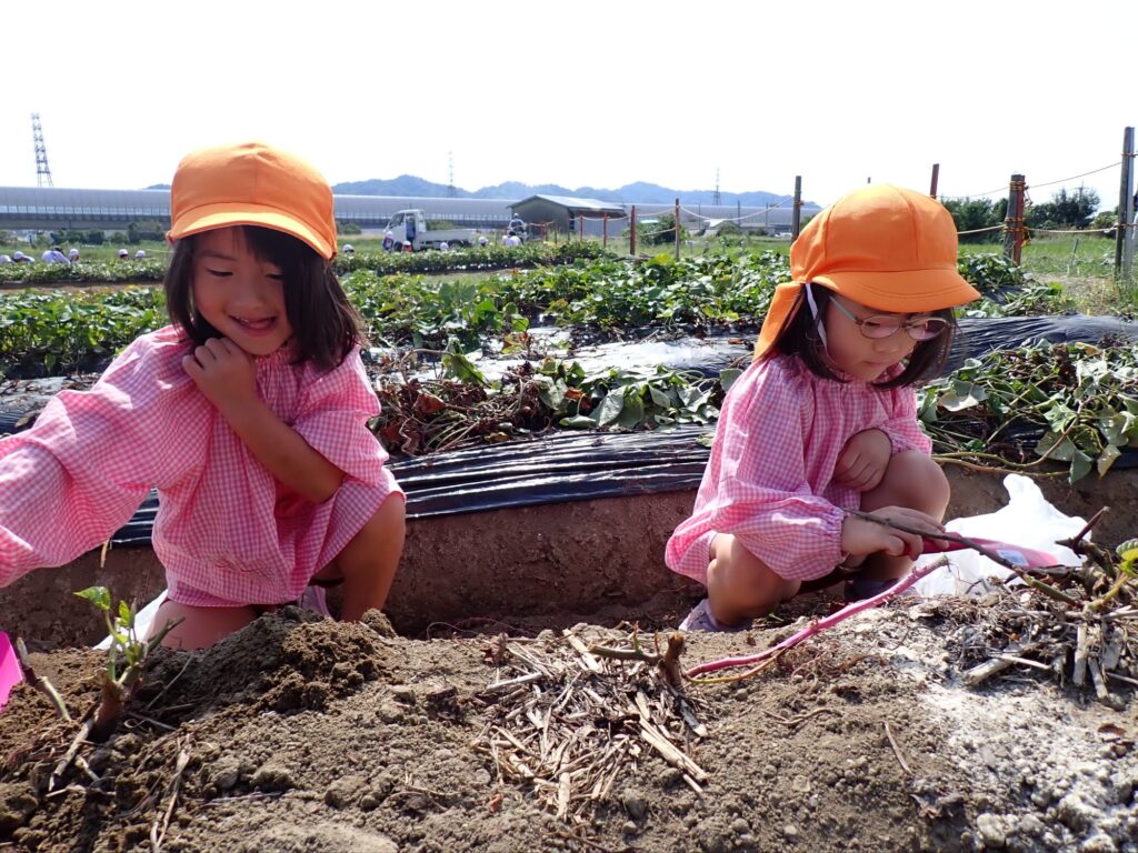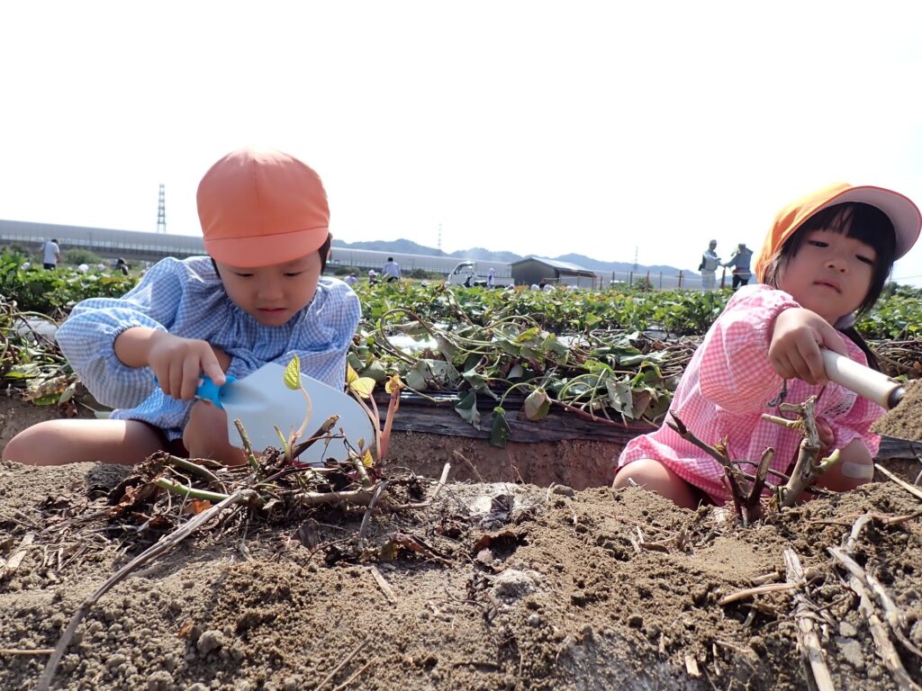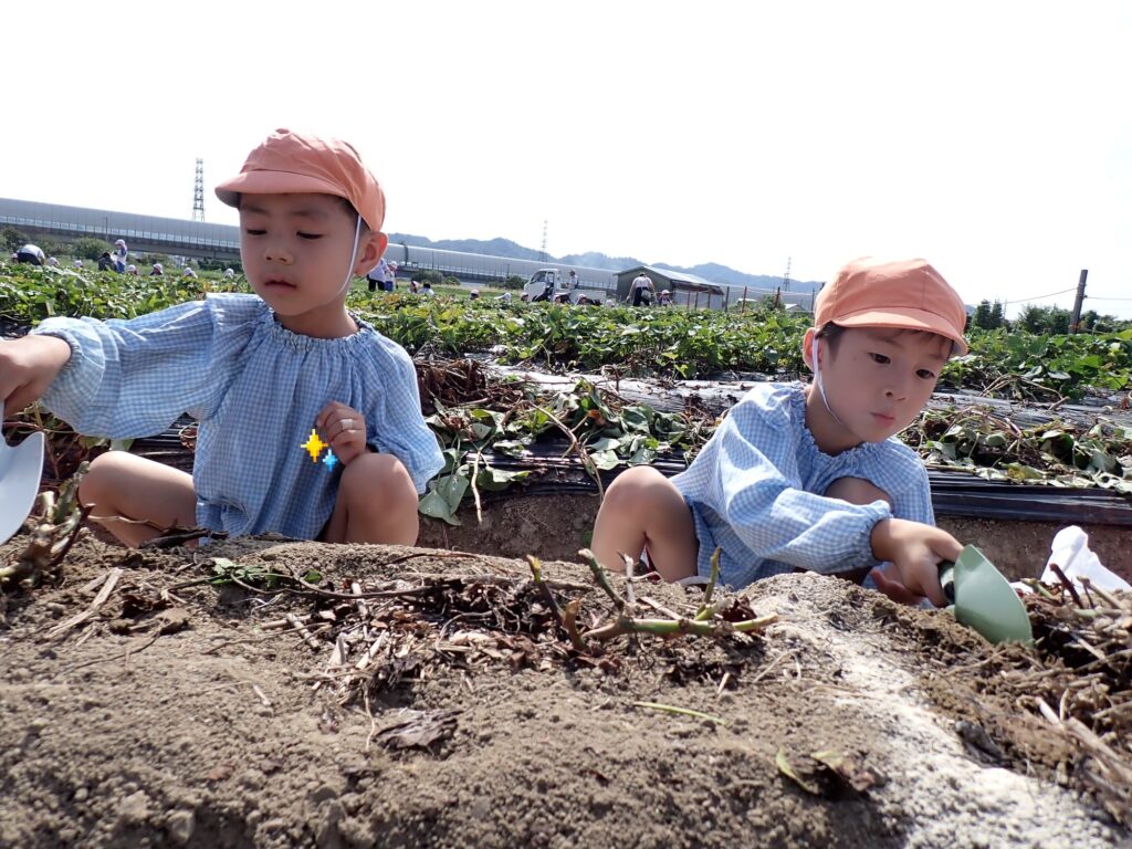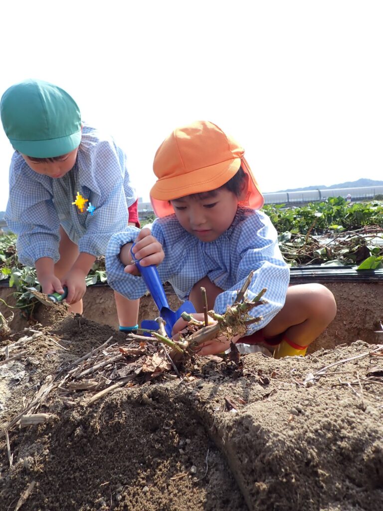 さつまいもがとれると、「つながってるー」「大きい!」と喜ぶもも組の子どもたち🍠