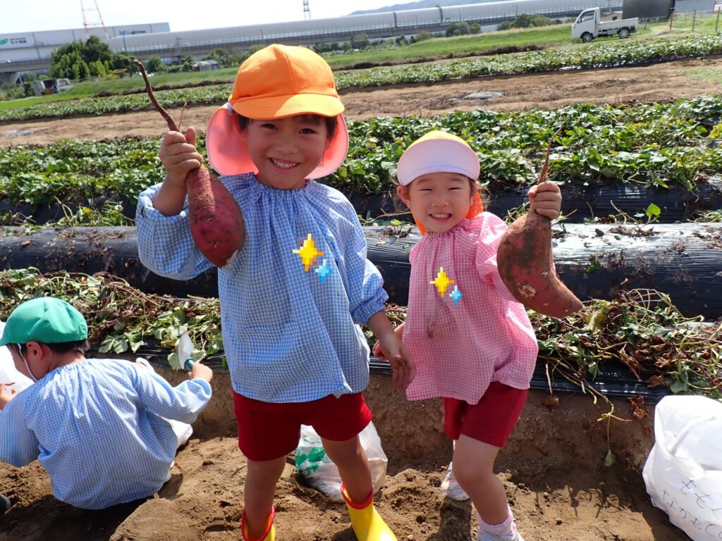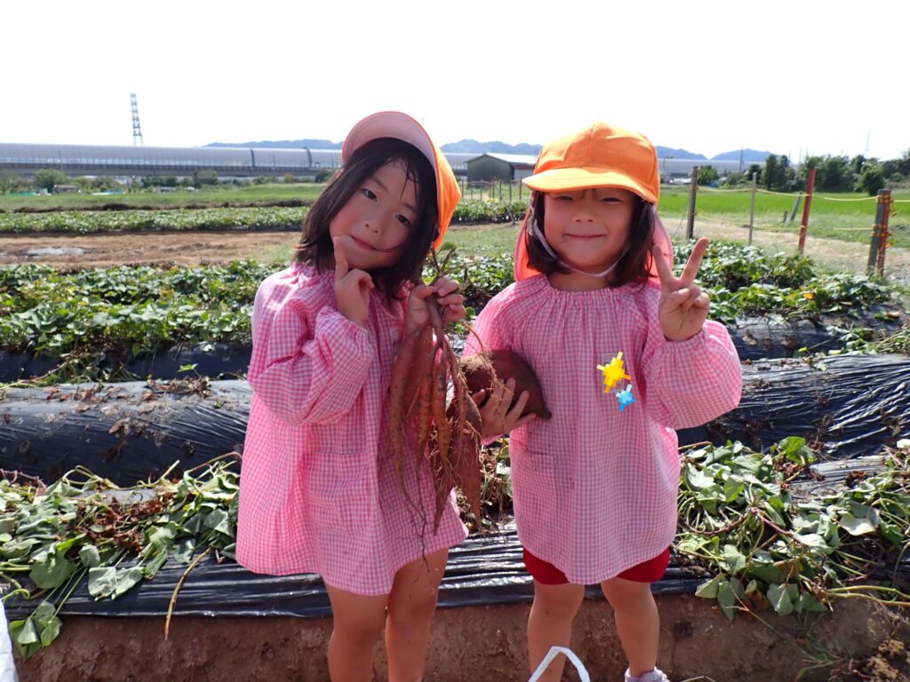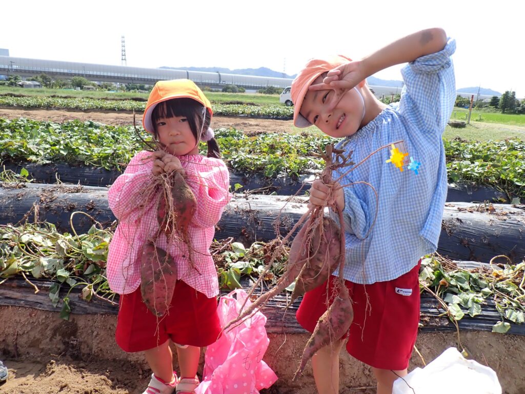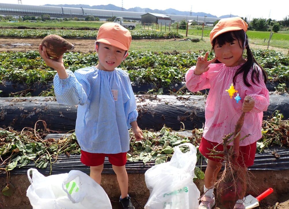 さつまいもがとれると、「つながってるー」「大きい!」と喜ぶもも組の子どもたち🍠