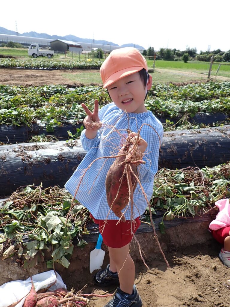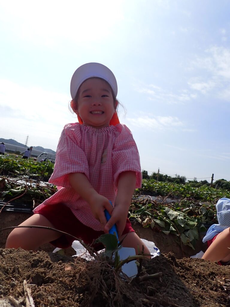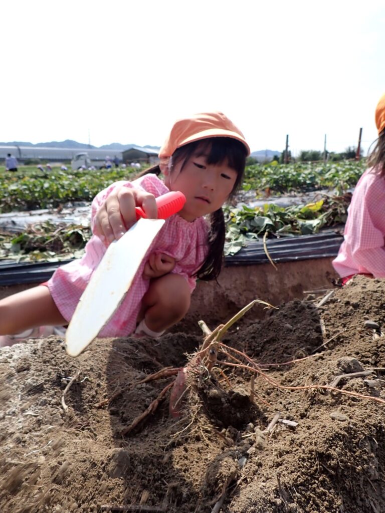 畑について、最初は怖々スコップで土をつついていましたが、さつまいもが見えると「先生!お芋見えた!!」と、どんどん掘り進めていました。