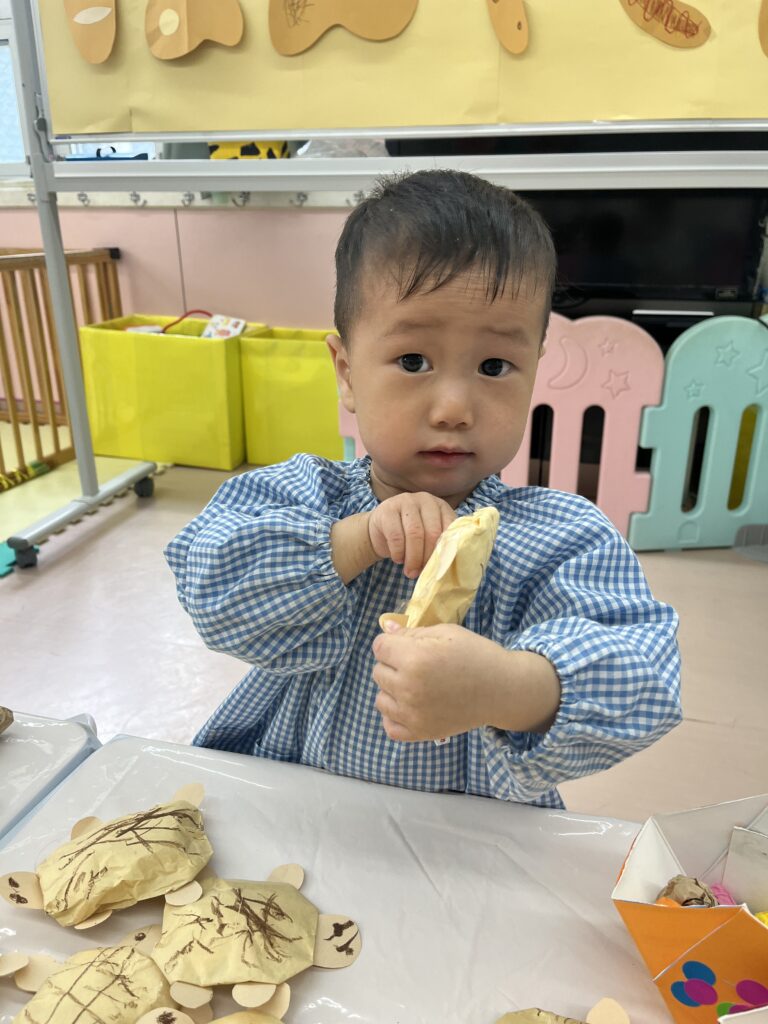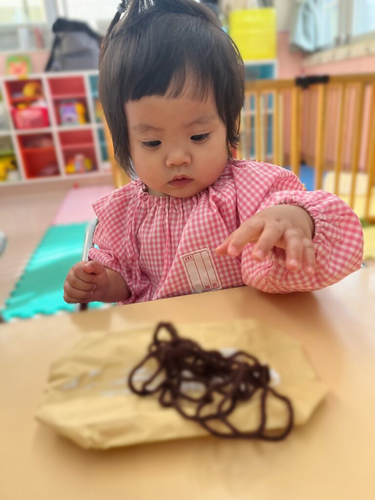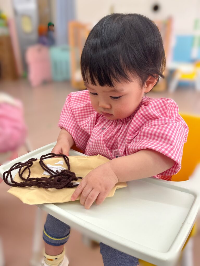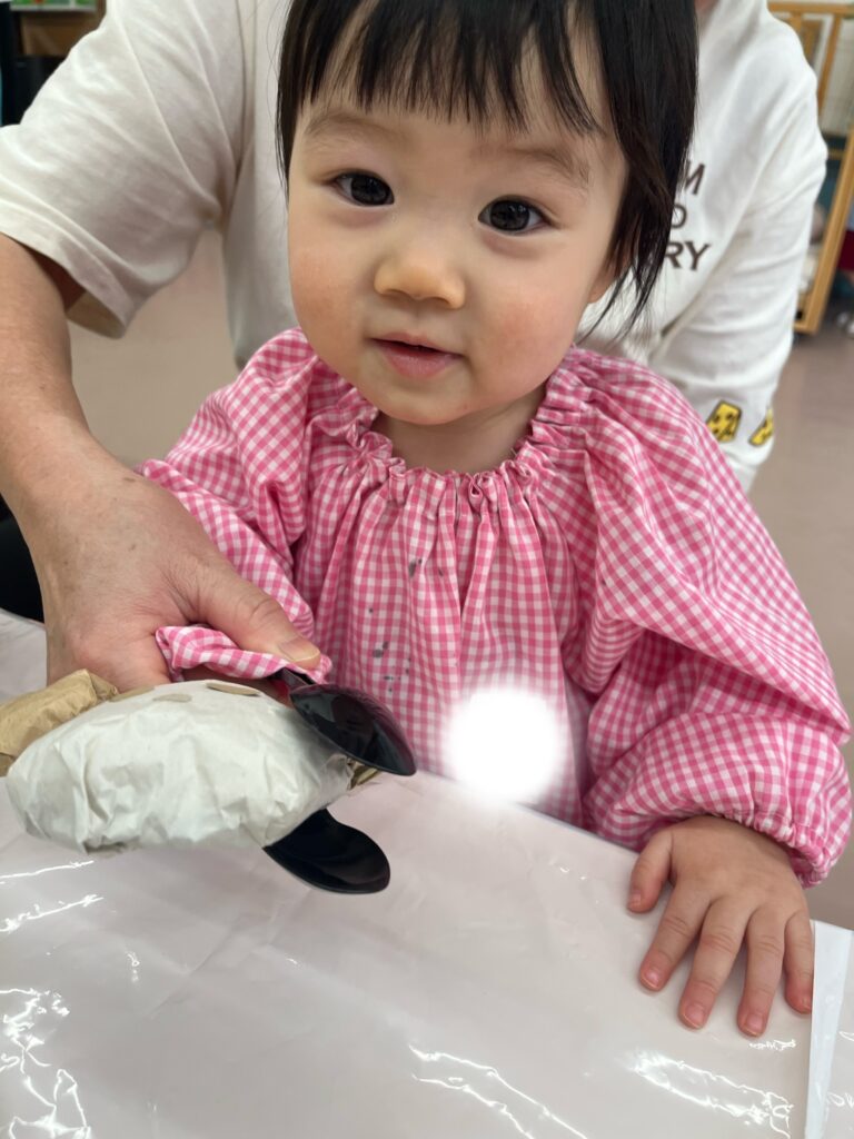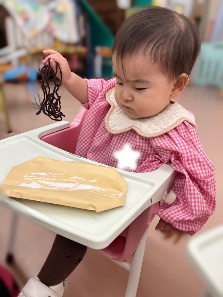 お店屋さんごっこに向けての制作では紙袋、封筒、毛糸など色々な素材に触れることができました!