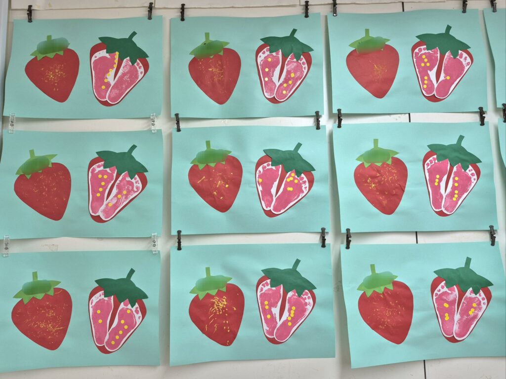 左側はクレパスでいちごのツブツブを表現しました✨