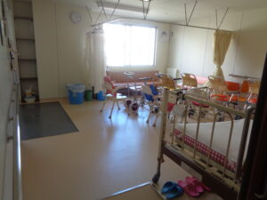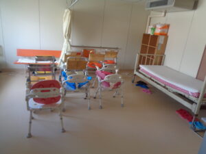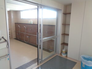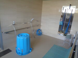 生駒園 大規模改修⑮ 大東市の特養(多床室) 改修後の一般浴室をはじめて使用しました。脱衣室の面積が広くなりゆったりと使用できるようになりました。浴槽へ入るためのスロープ、浴室と脱衣室との境目、それぞれ段差が解消されシャワーチェアーでの移動がスムーズになりました。また、浴槽壁面に新しく設置した縦型手すりも活用し、より安全に入浴して頂けるようになりました。