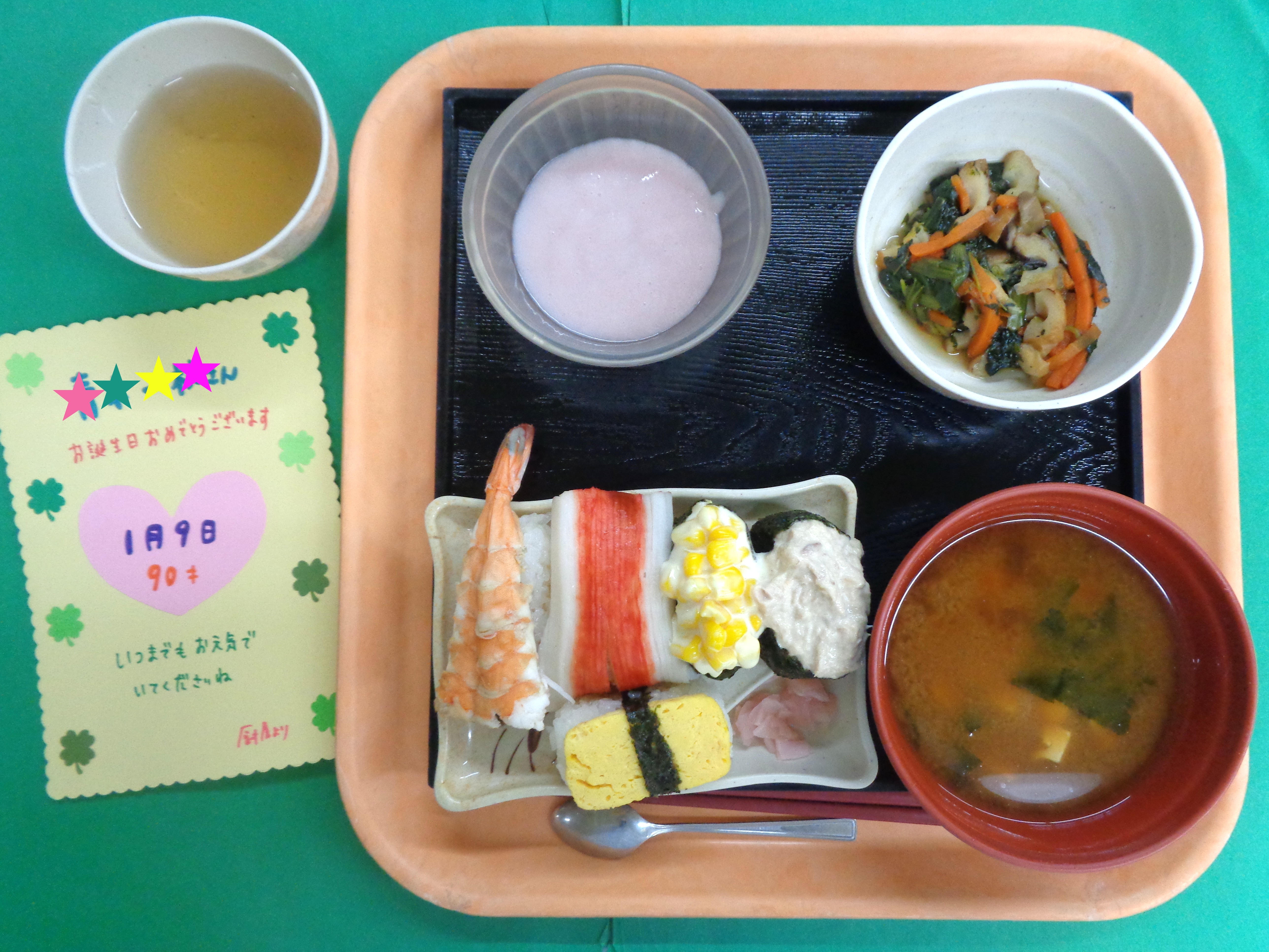 施設では生魚を提供できないので、お刺身を乗せる事はできないのですが…利用者さんに喜んでいただけるよう、できるだけ握り寿司に近づけてみました🌟