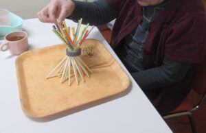割り箸で支えられた柱を崩さないようにしながら、
