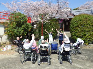 六万寺園/「お花見 第2弾」/東大阪市/特養/多床室 暑いくらいのお天気のなか、今年2度目のお花見へ行ってきました🎶 今年は、前回のお花見と合わせて総勢25名の利用者さんにお花見を楽しんでいただくことが出来ました! 皆さん、本当に良い笑顔で😄一緒に行った職員もとても楽しいひと時を過ごすことが出来ました🎶 来年は、今年行けなかった利用者さん達とまた一緒にお花見へ行けますように🌸