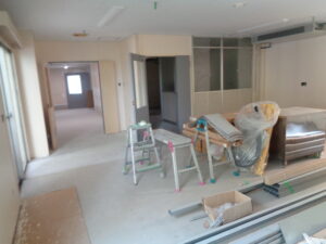 生駒園/大規模改修⑲/(大東市の特養:多床室) 連日、沢山の工事関係者の方に来て頂き、建物内だけでなく外回りの工事も進んでいます。 窓から見える作業の様子を、利用者さん・職員共に楽しみにしながら見ています。 職員は、作業の方が帰られた後に、建物内の工事箇所を覗きに行き、出来上がりを想像しながら楽しみにしています。