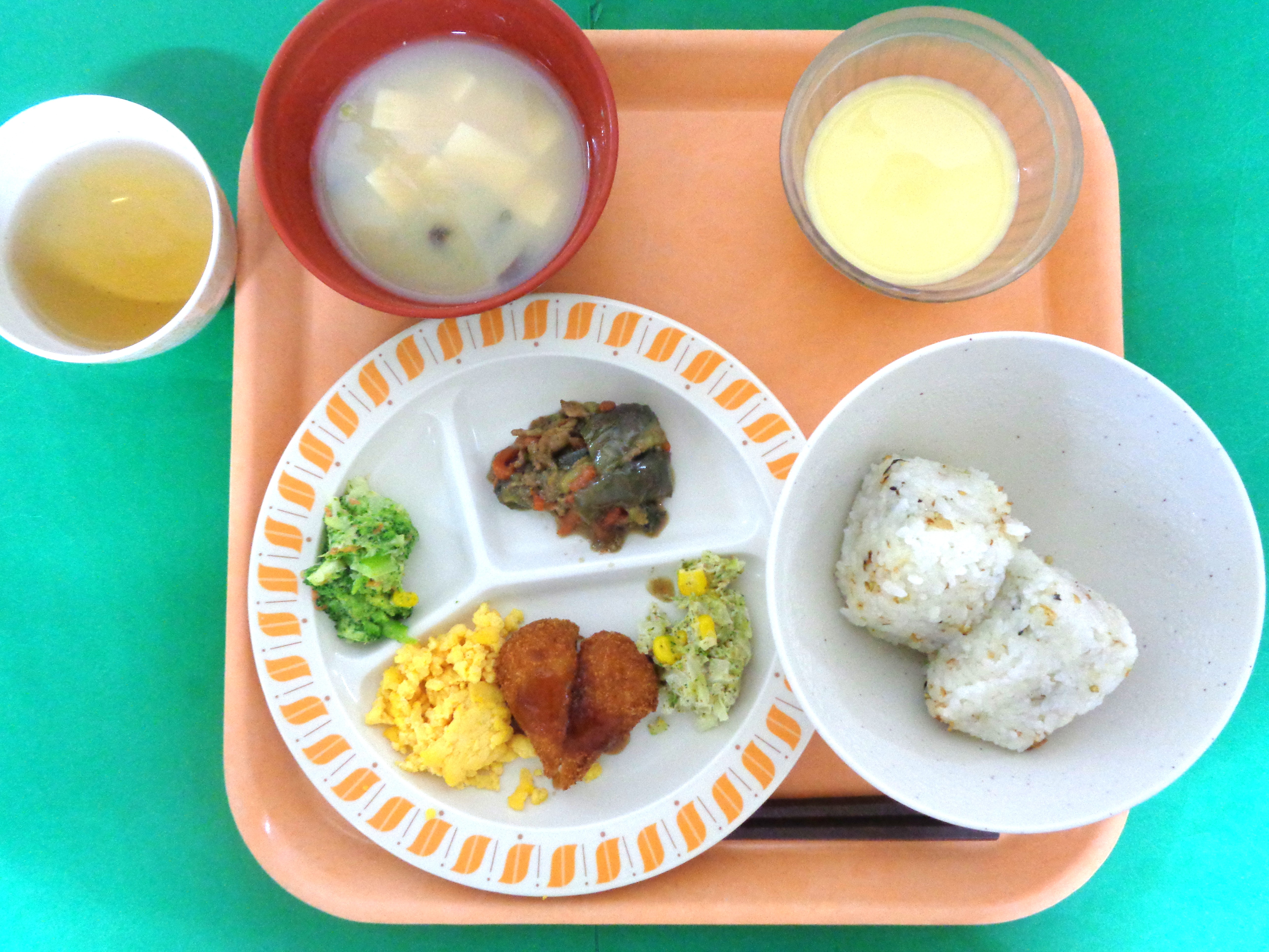 メニューは…おにぎり(かつお)・味噌汁(しいたけ、豆腐)・スクランブルエッグ・カニクリームコロッケ・ナスと豚肉のピリ辛炒め・マヨネーズ和え(ブロッコリー)・フルーツ牛乳 です✨