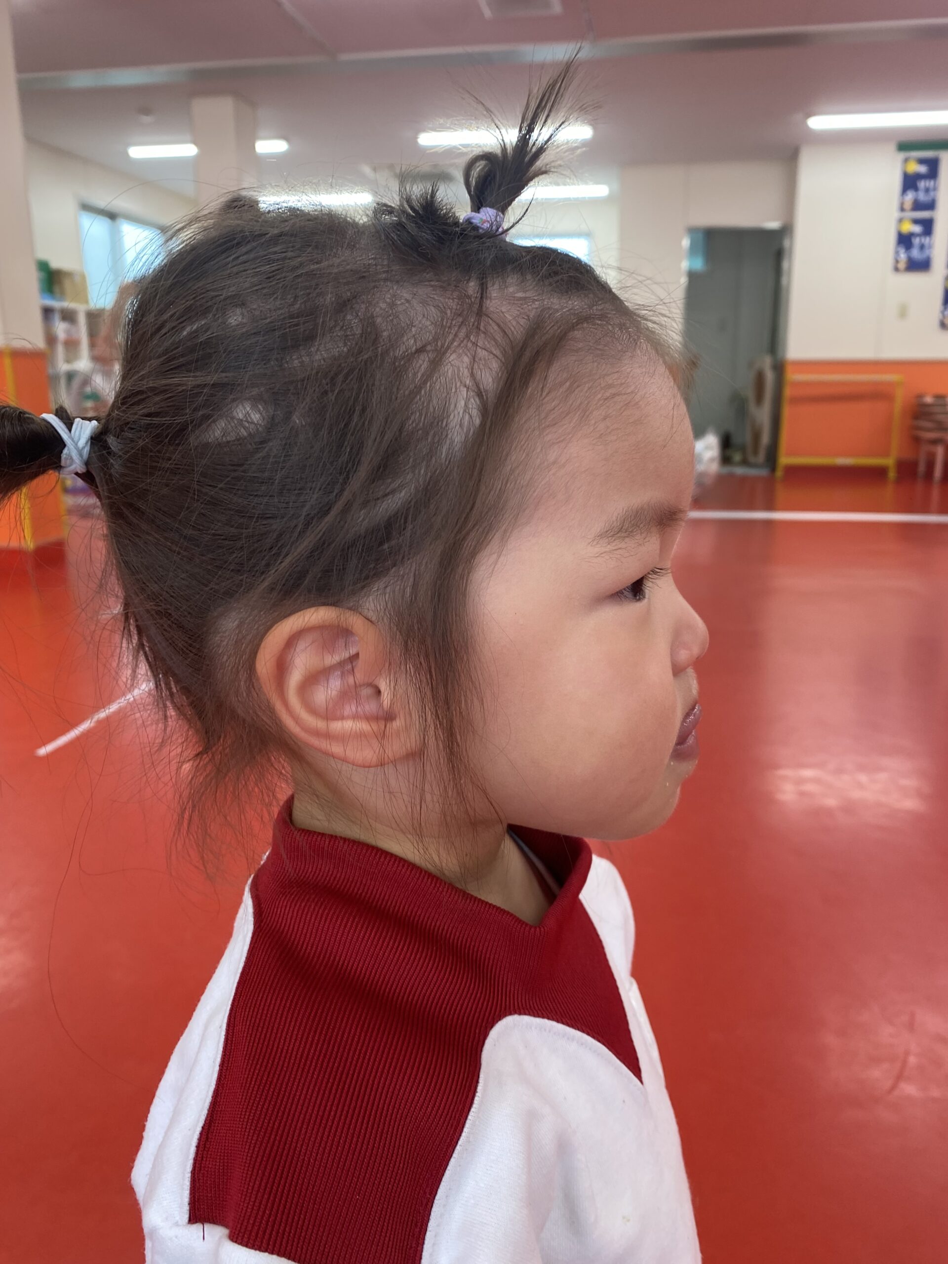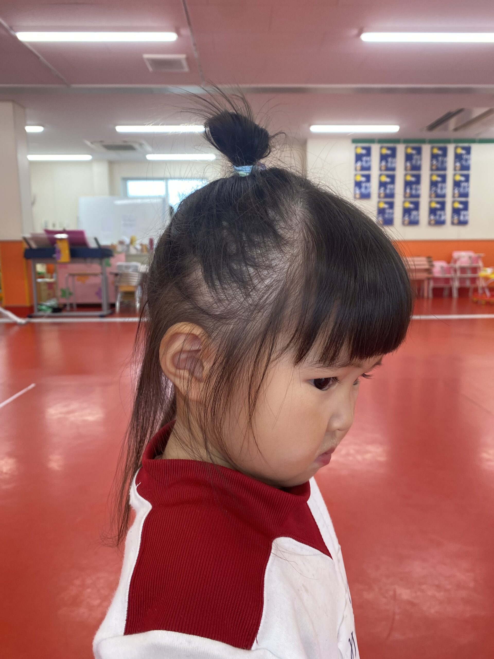 運動会本番の髪型ですが、髪飾りを付ける為、頭の上の部分でお団子をしていただきたいです。⬇️