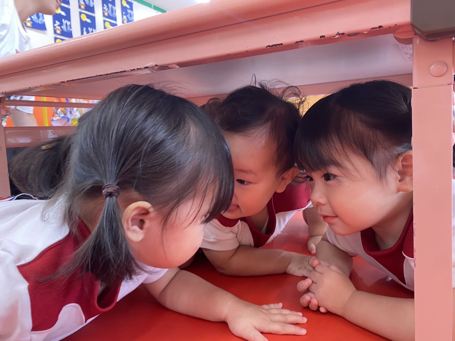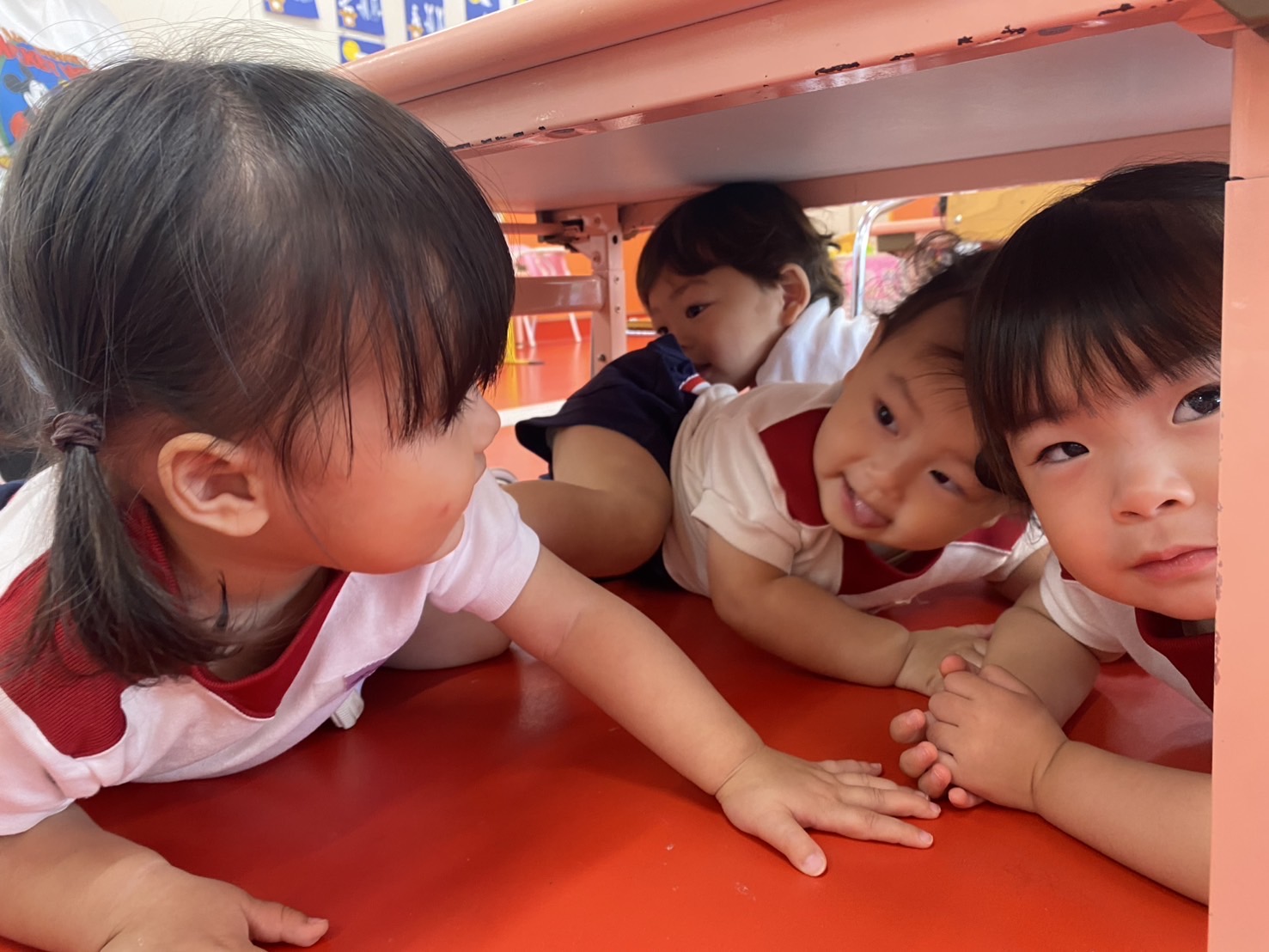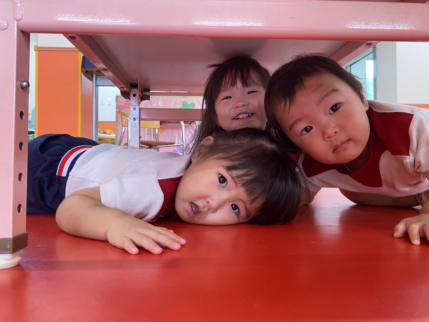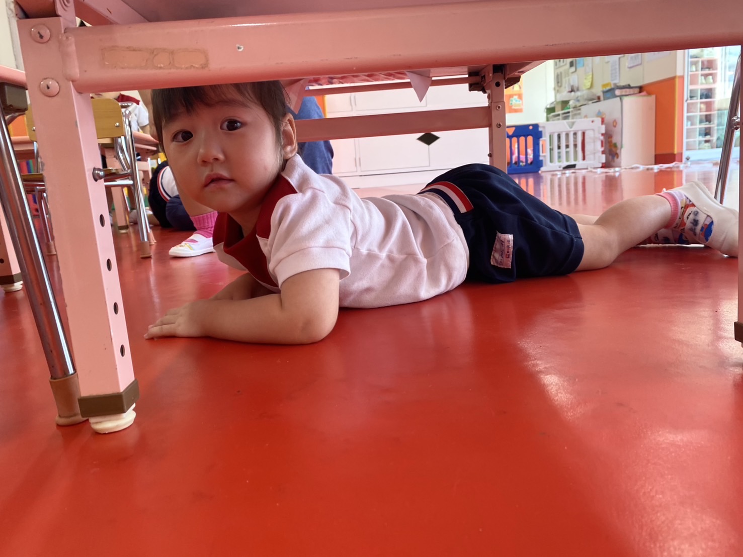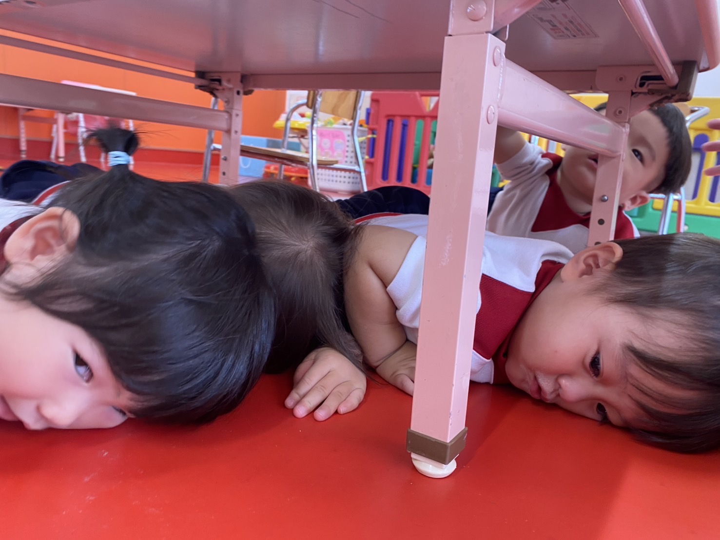 しっかりお話を聞き上手に机の下に隠れることができた子どもたちです☺️