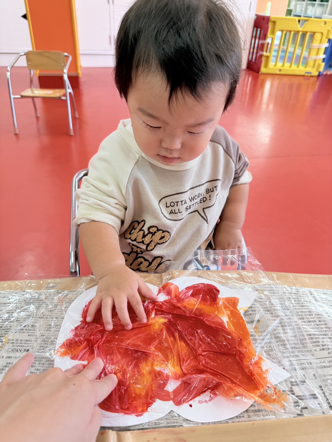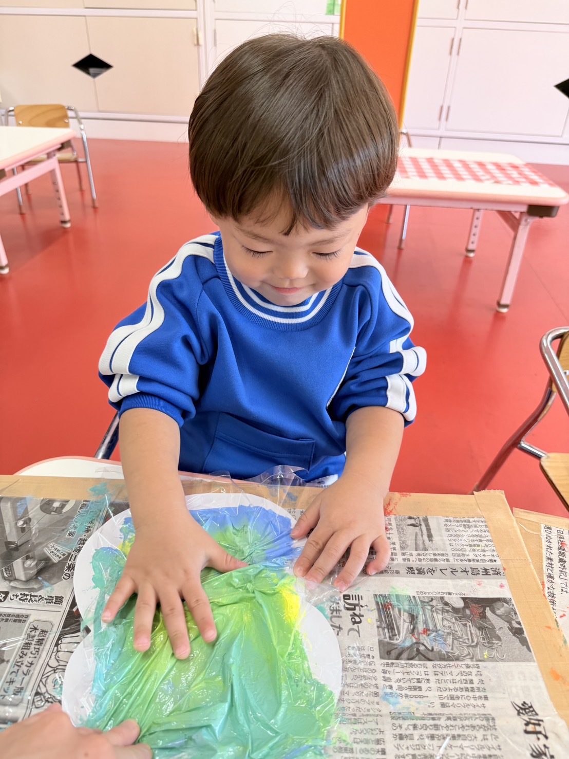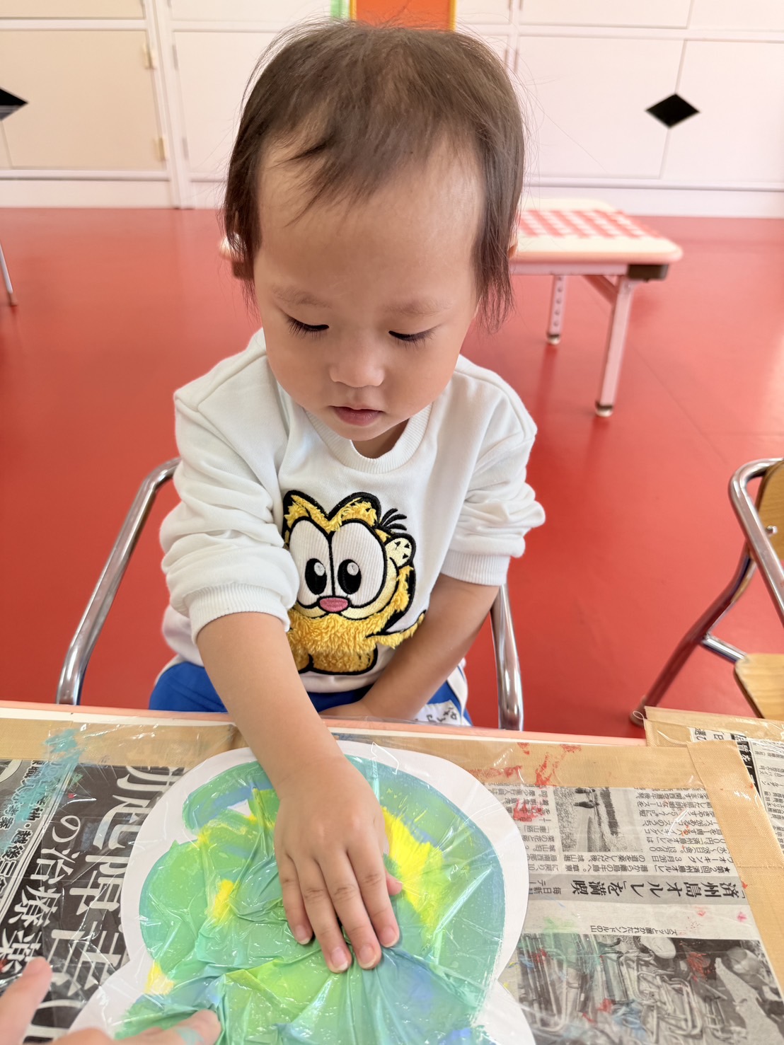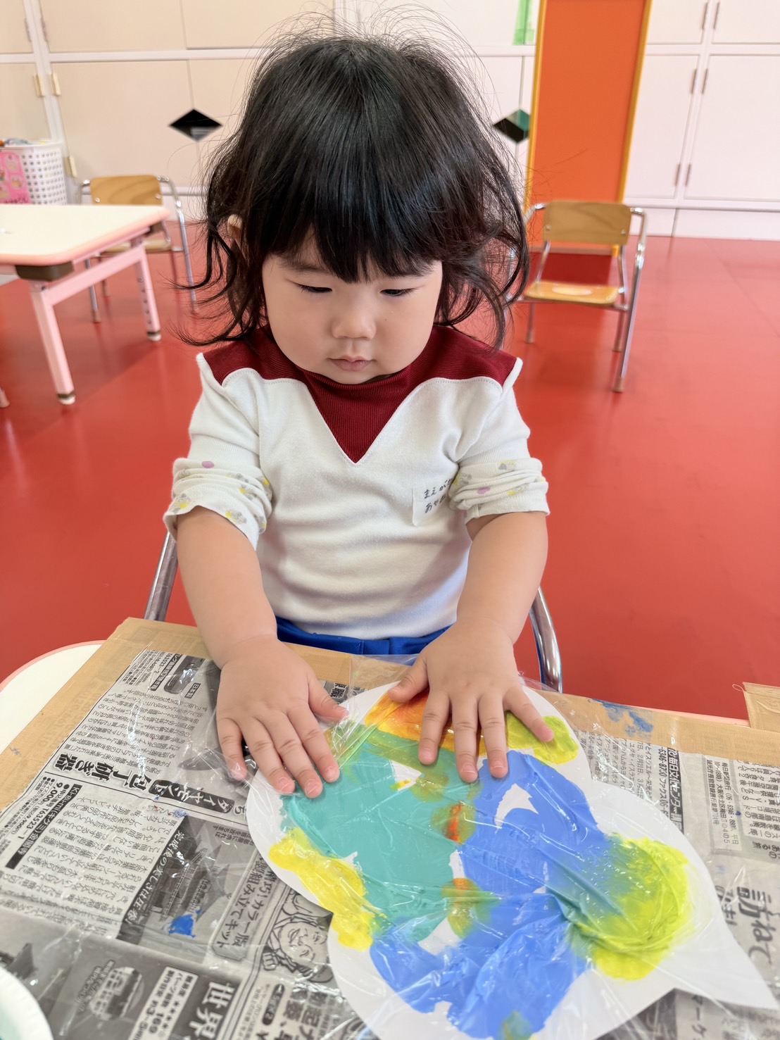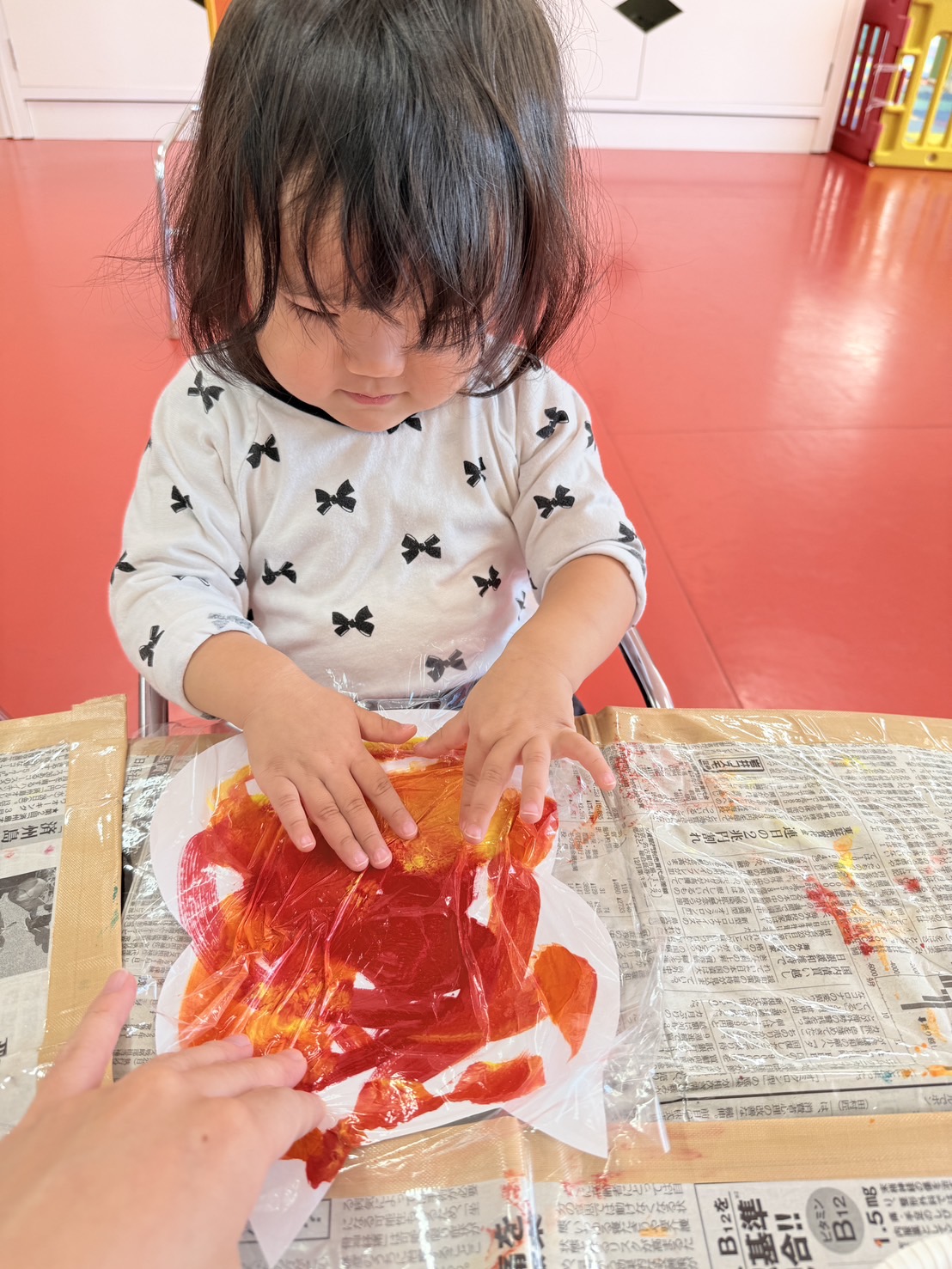 壁面では好きな色の絵の具を塗った後、上から絵の具を押さえて感触を楽しみました😊