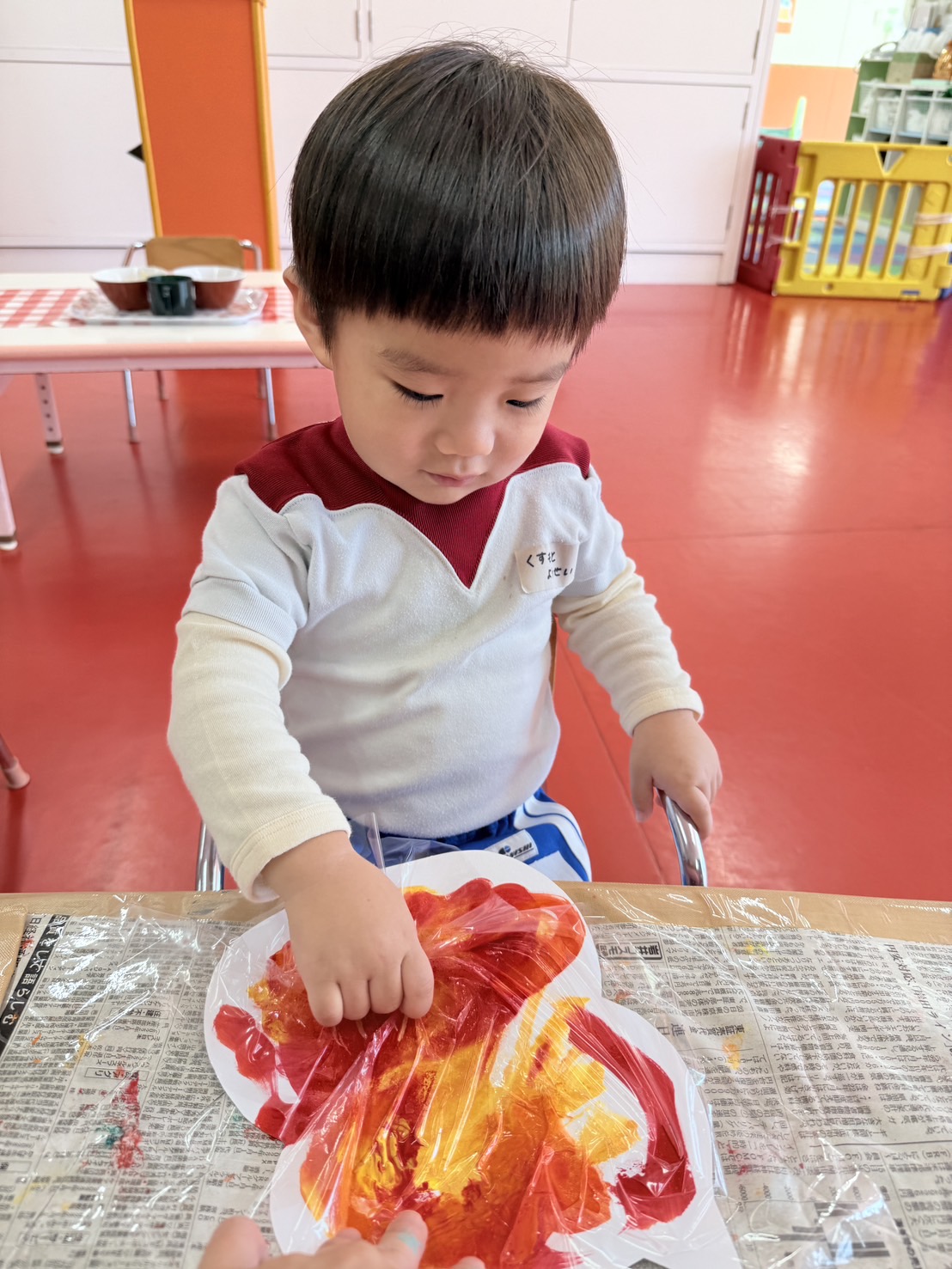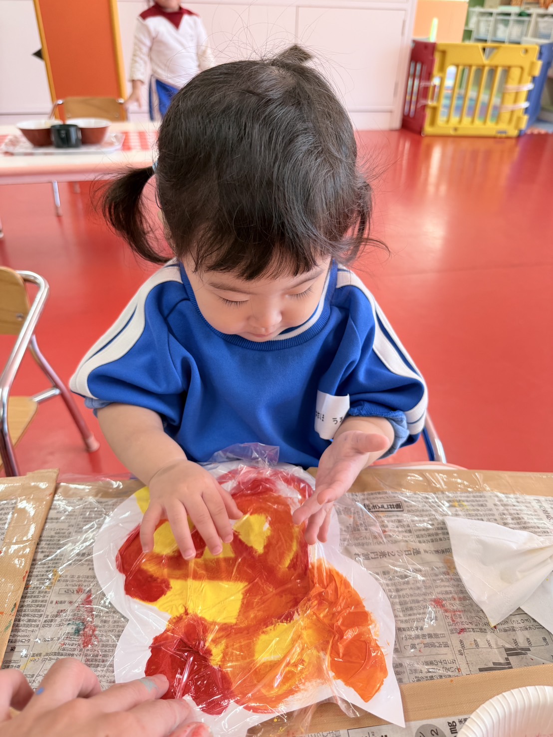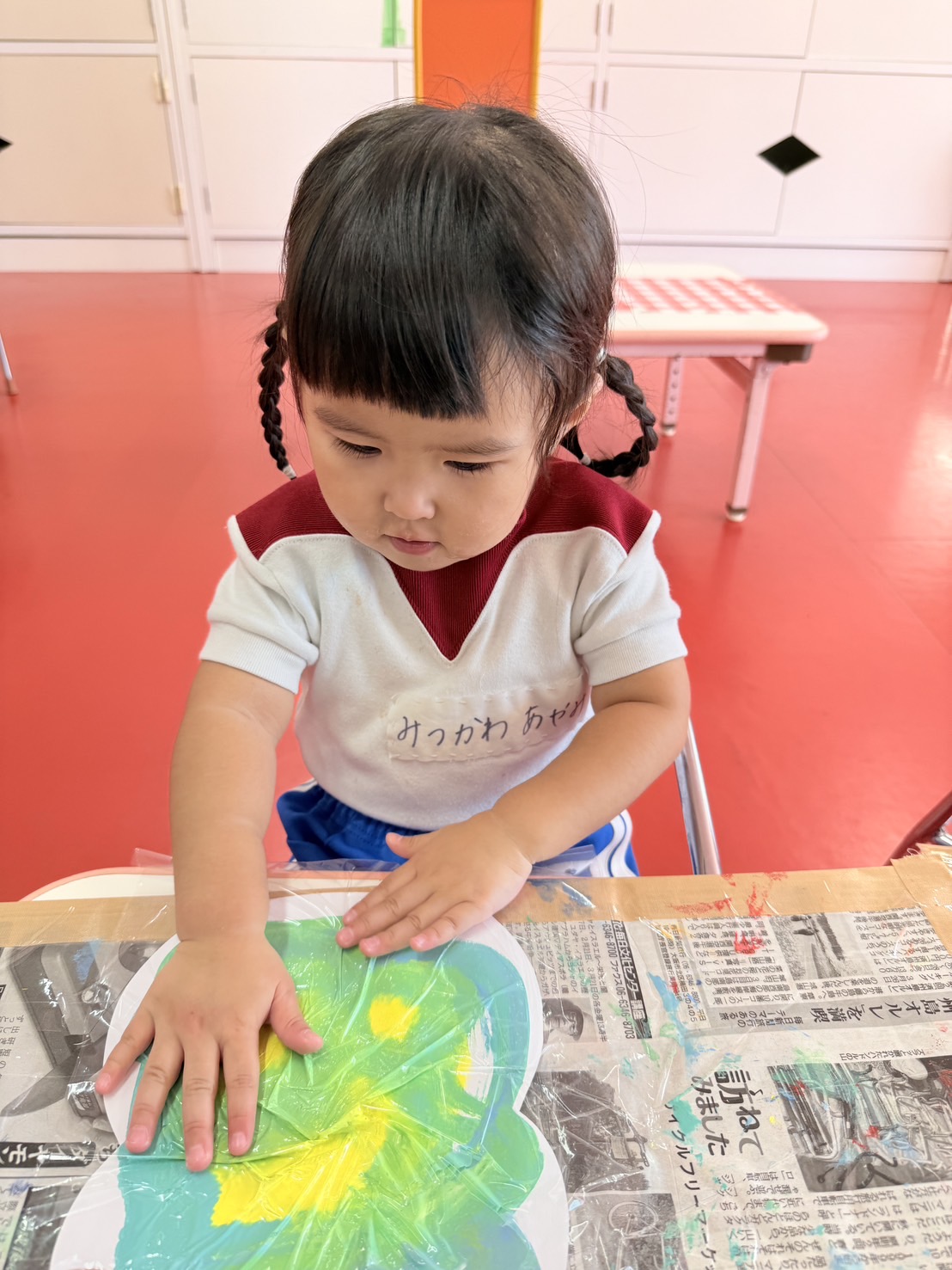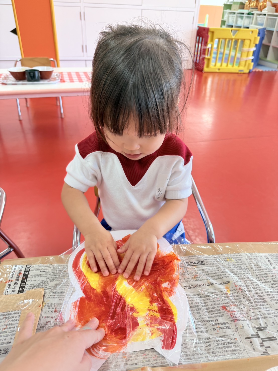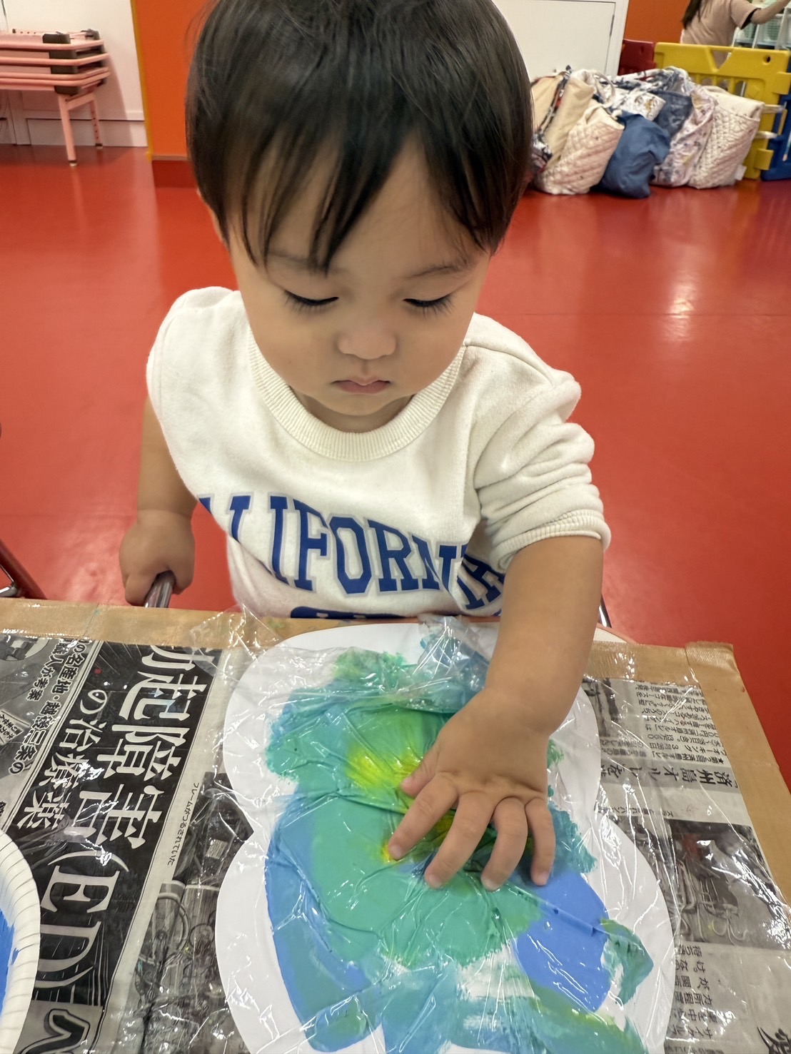 壁面では好きな色の絵の具を塗った後、上から絵の具を押さえて感触を楽しみました😊