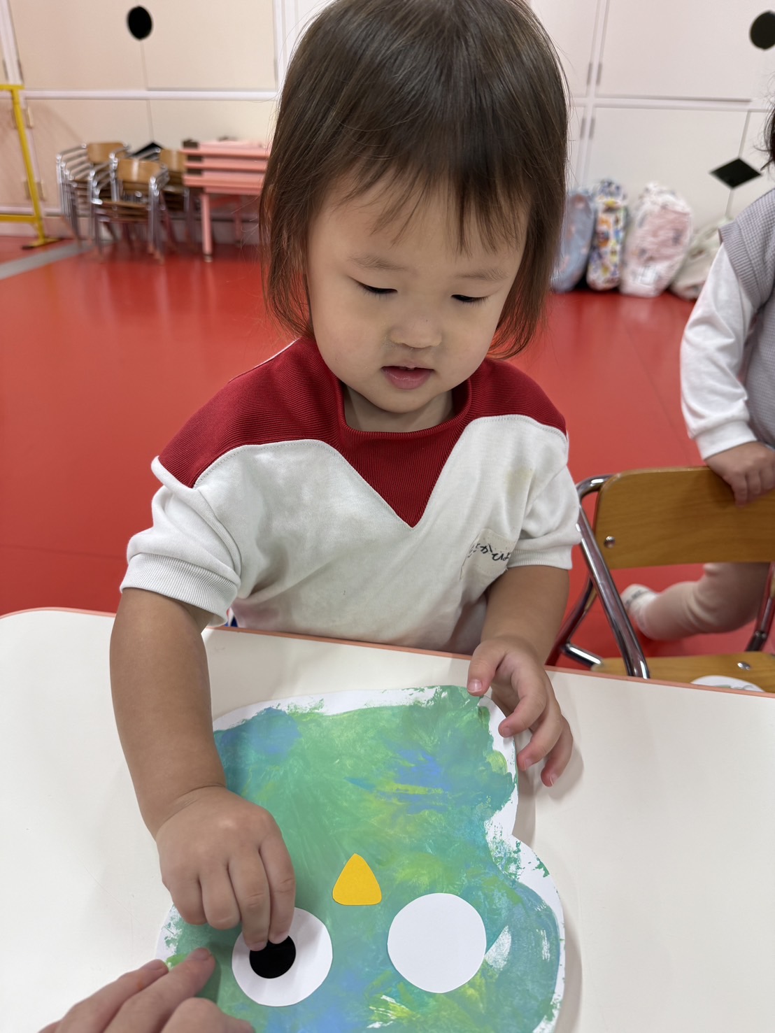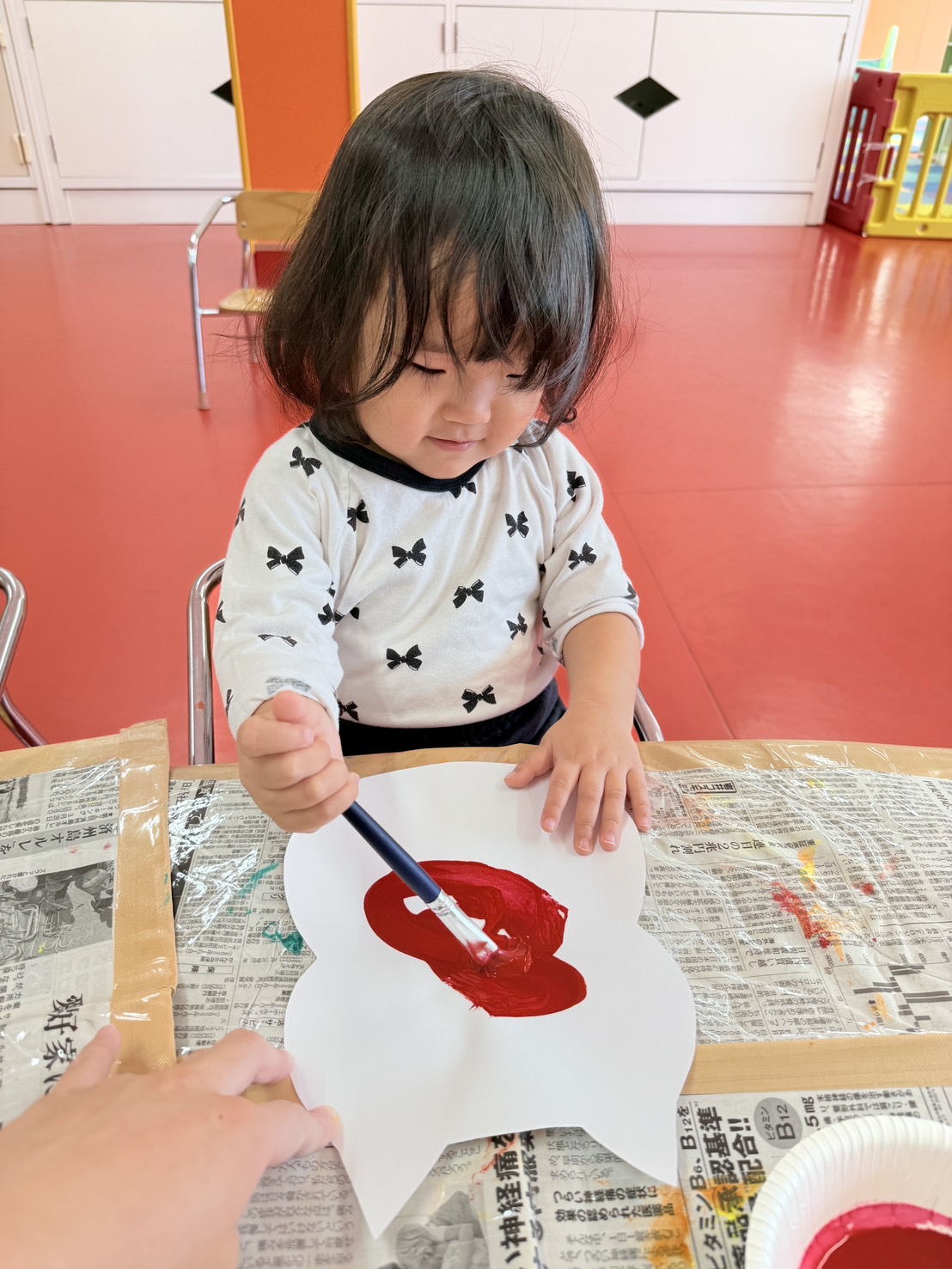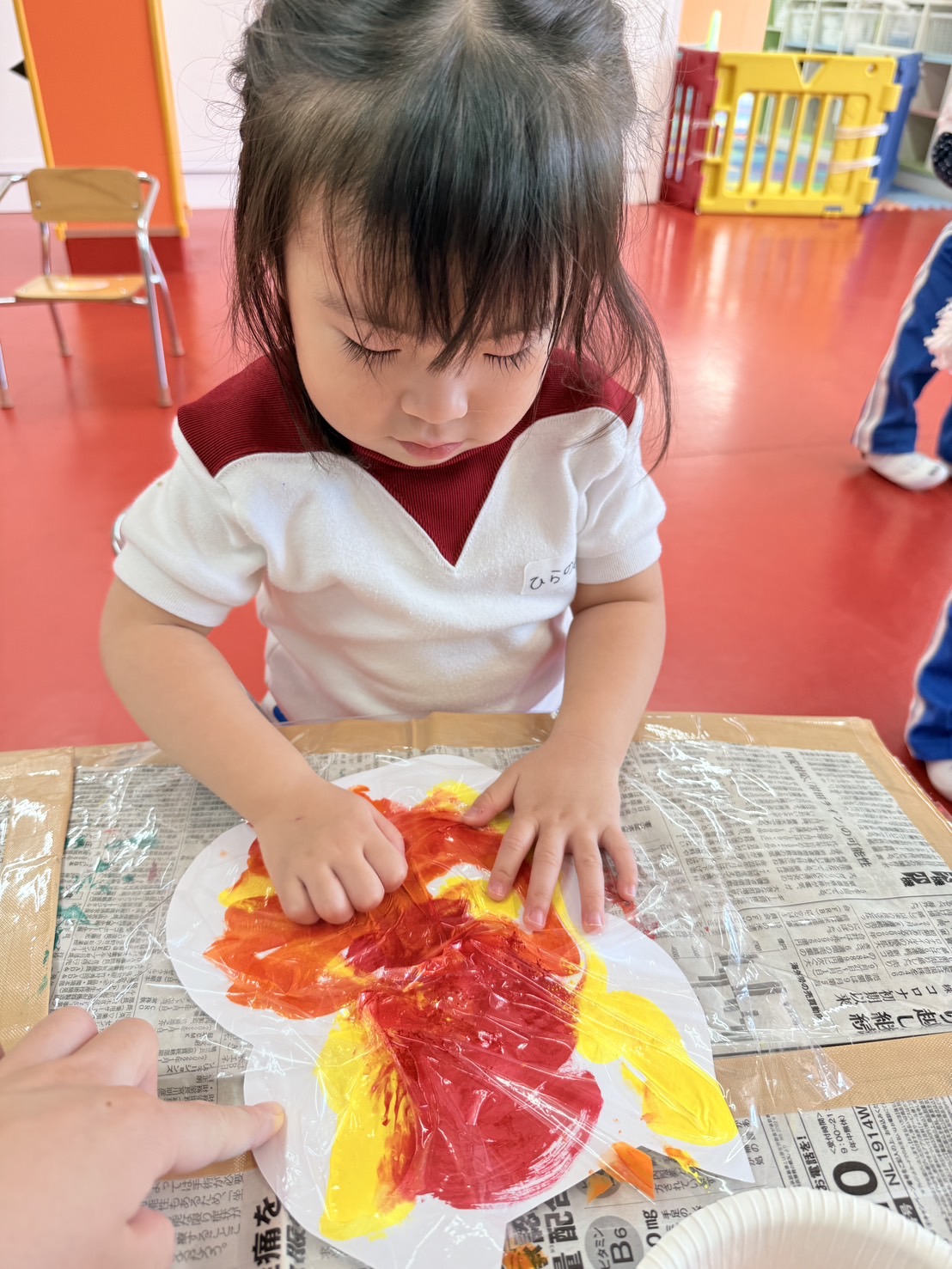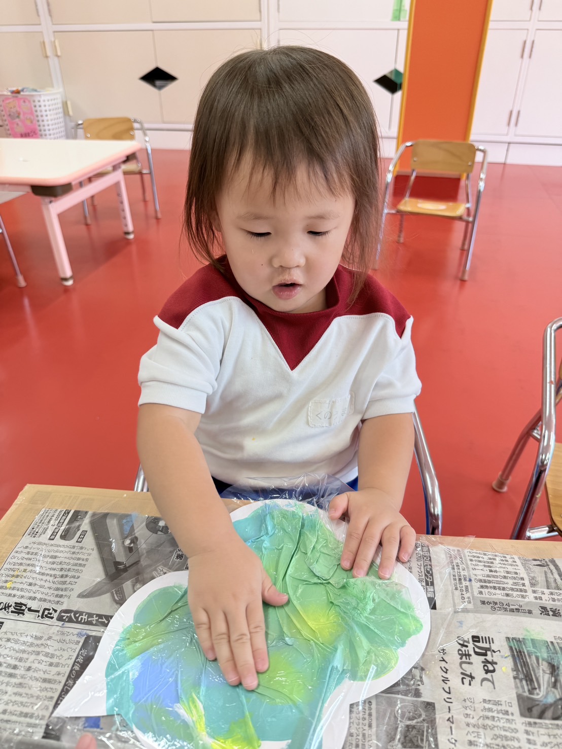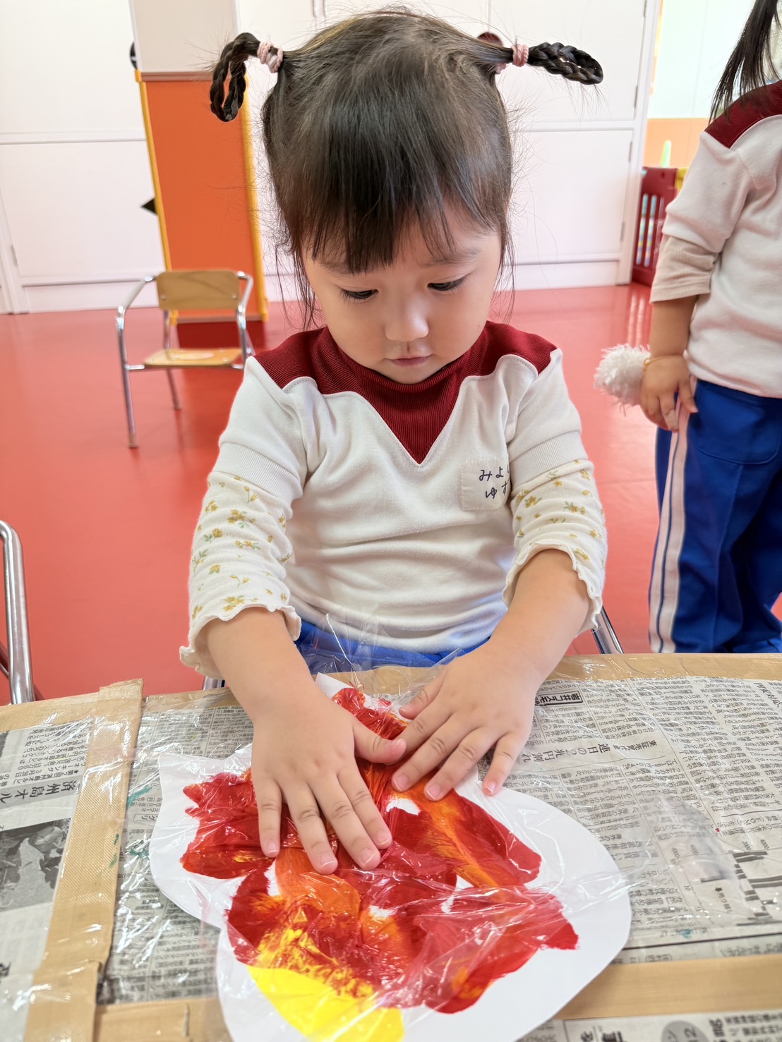 壁面では好きな色の絵の具を塗った後、上から絵の具を押さえて感触を楽しみました😊