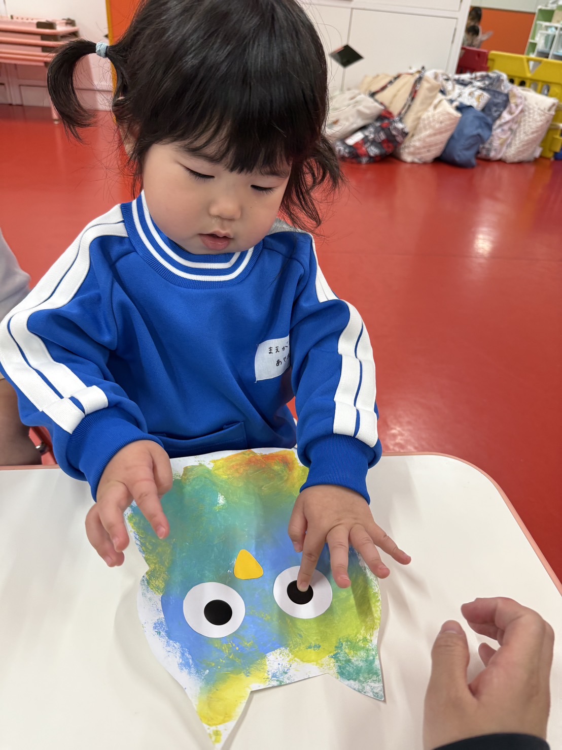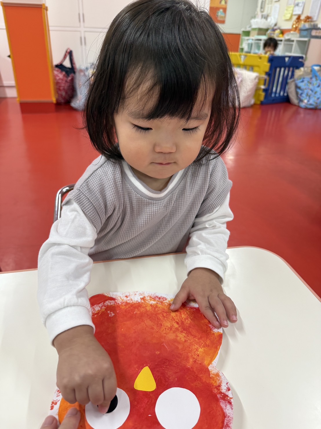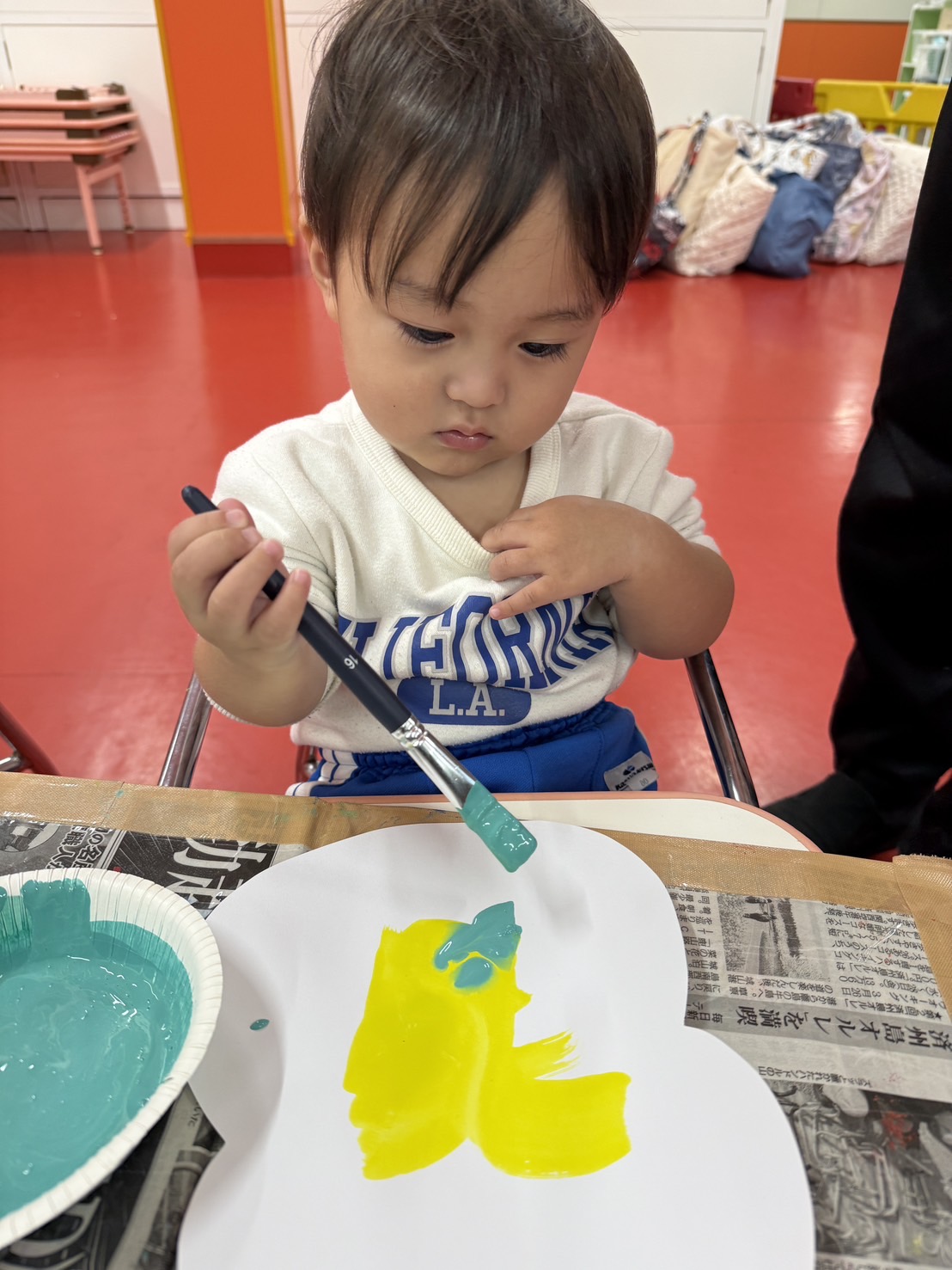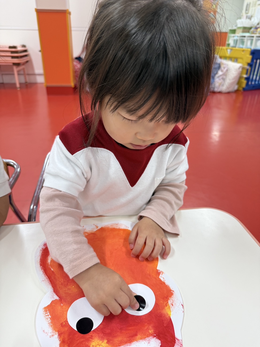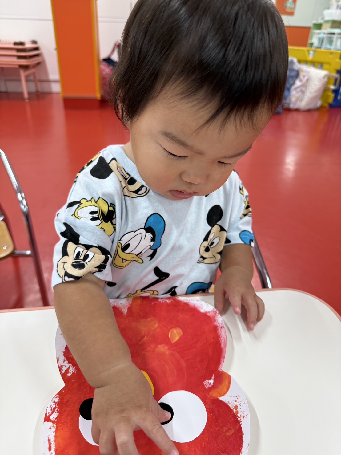 壁面では好きな色の絵の具を塗った後、上から絵の具を押さえて感触を楽しみました😊