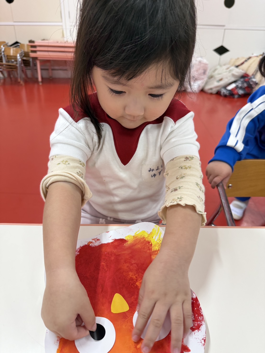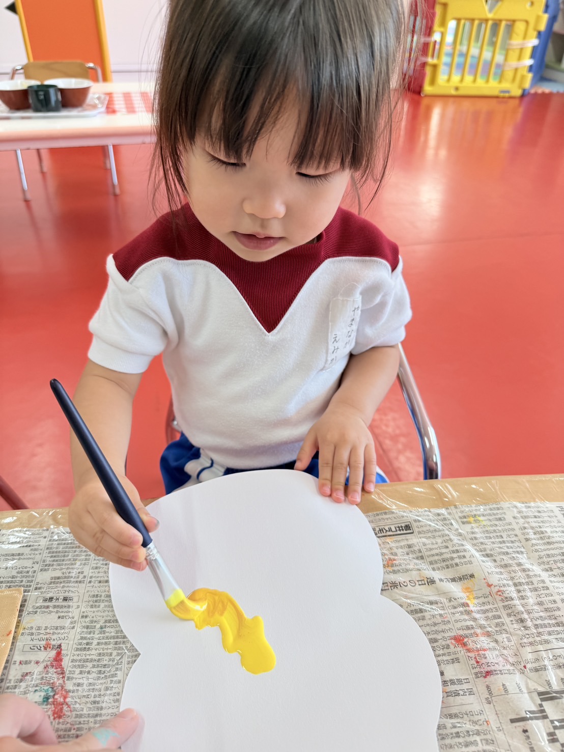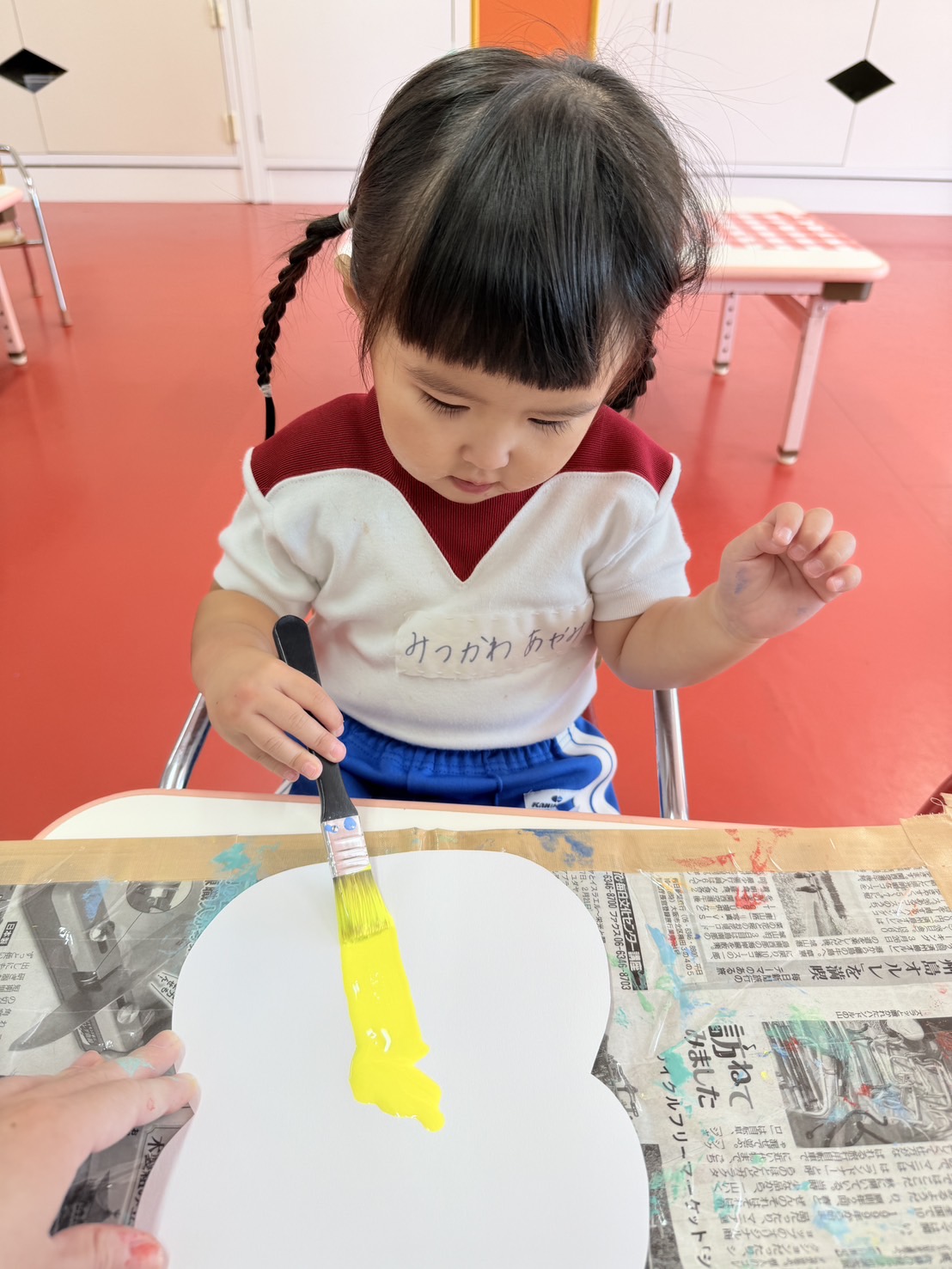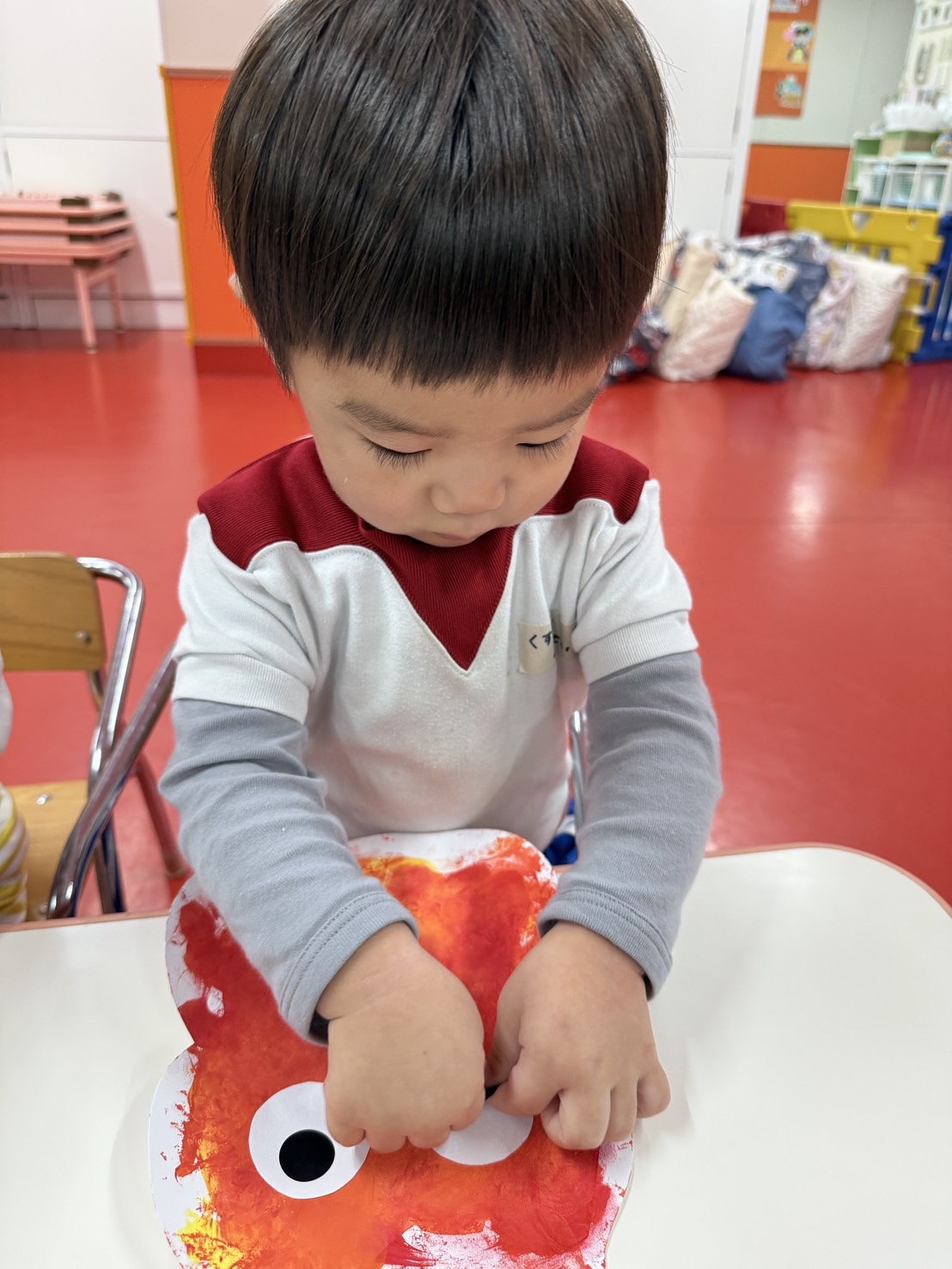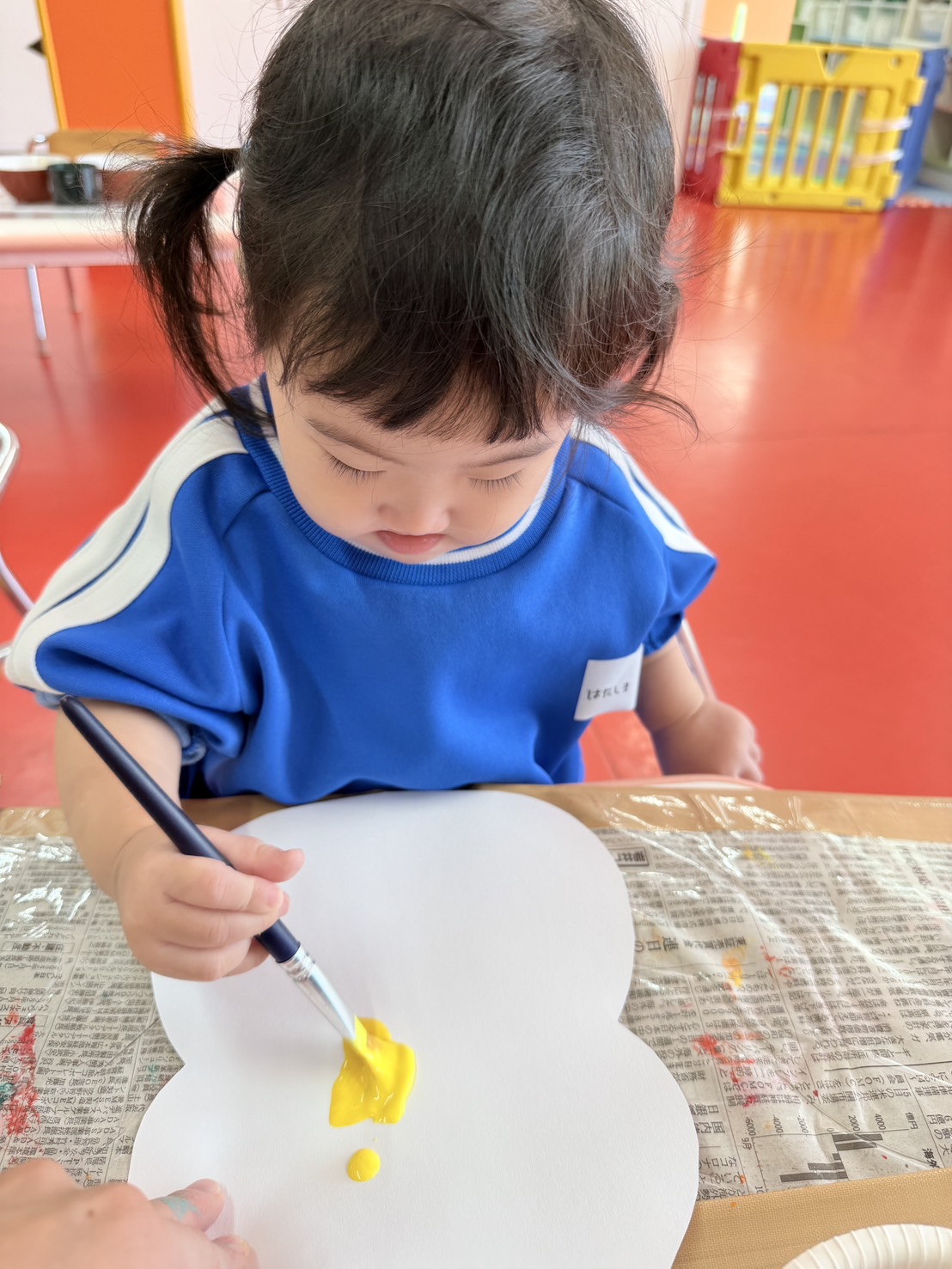 壁面では好きな色の絵の具を塗った後、上から絵の具を押さえて感触を楽しみました😊
