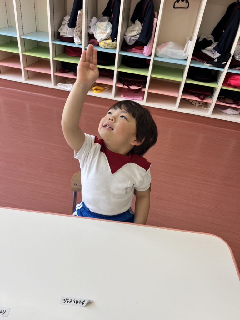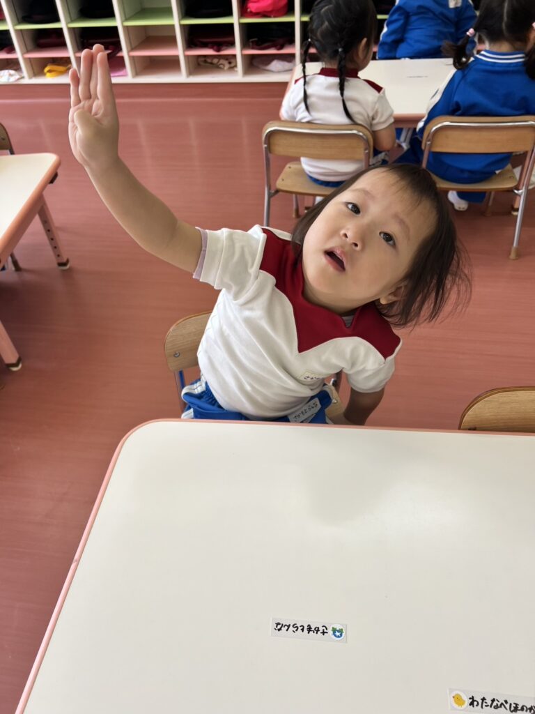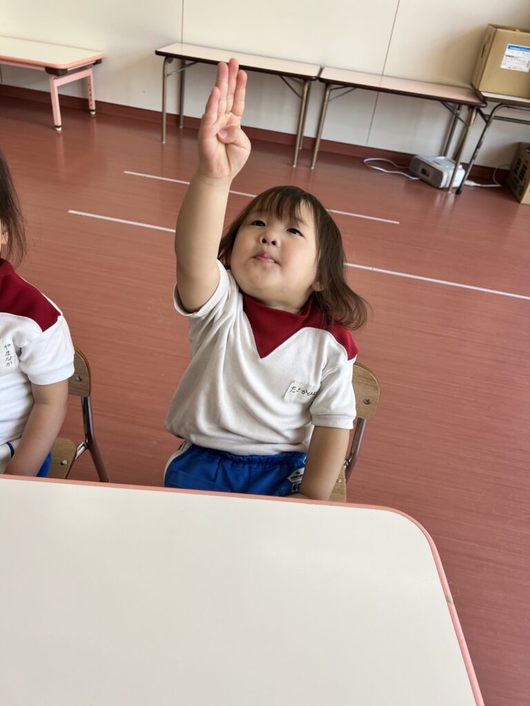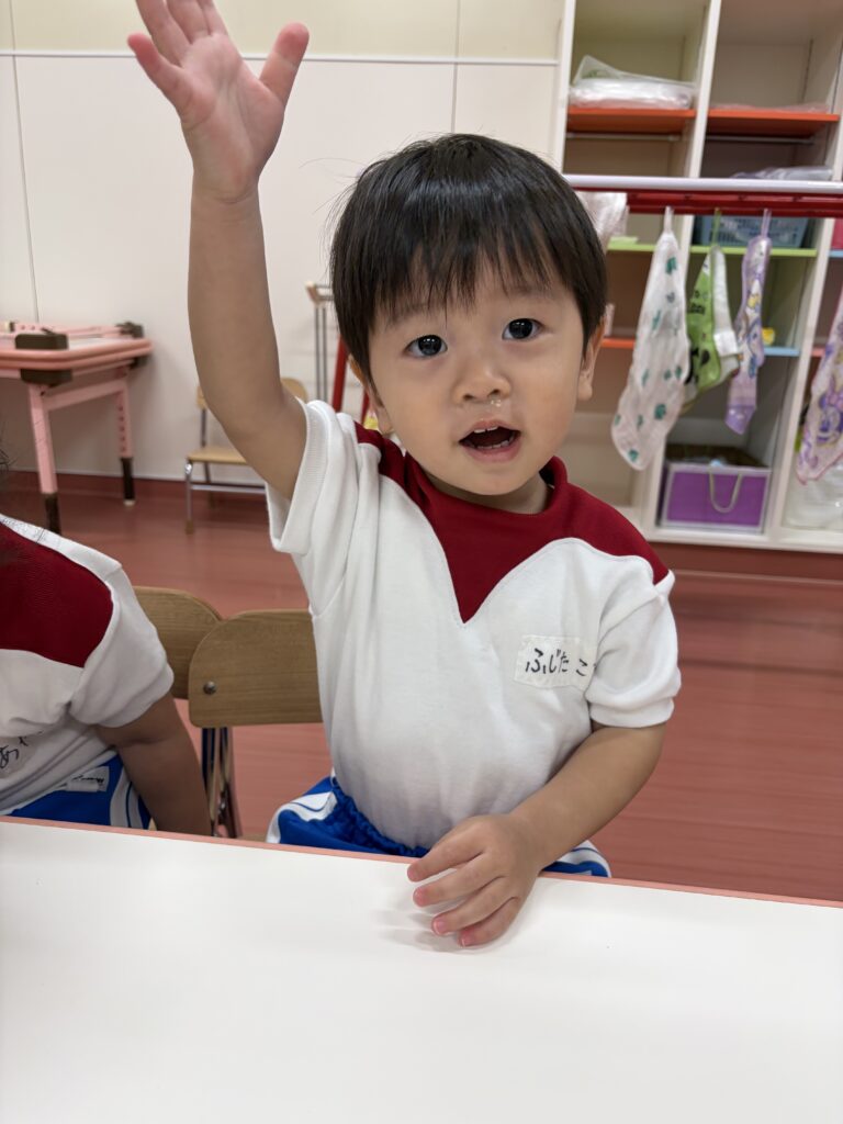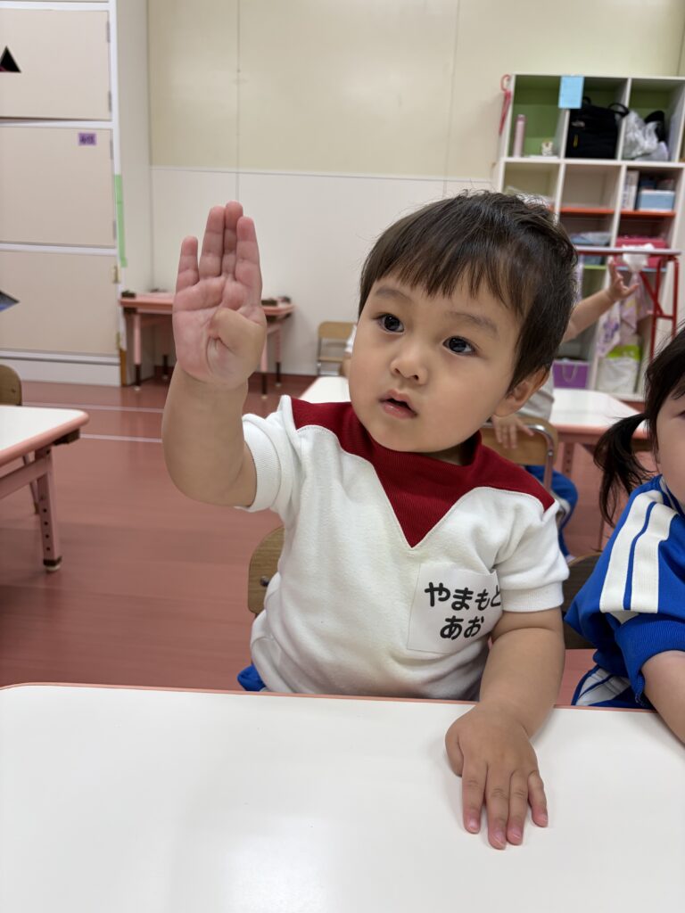 4の指で手をまっすぐ上げ、かっこいいさくらんぼさん、ぶどうさんです✨