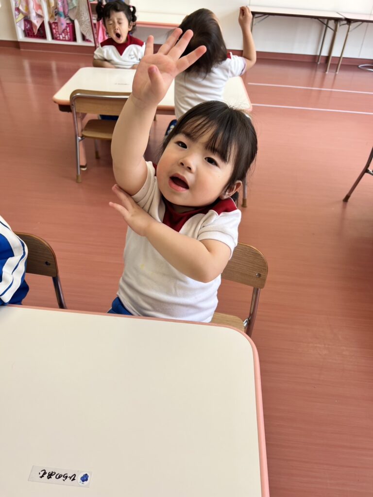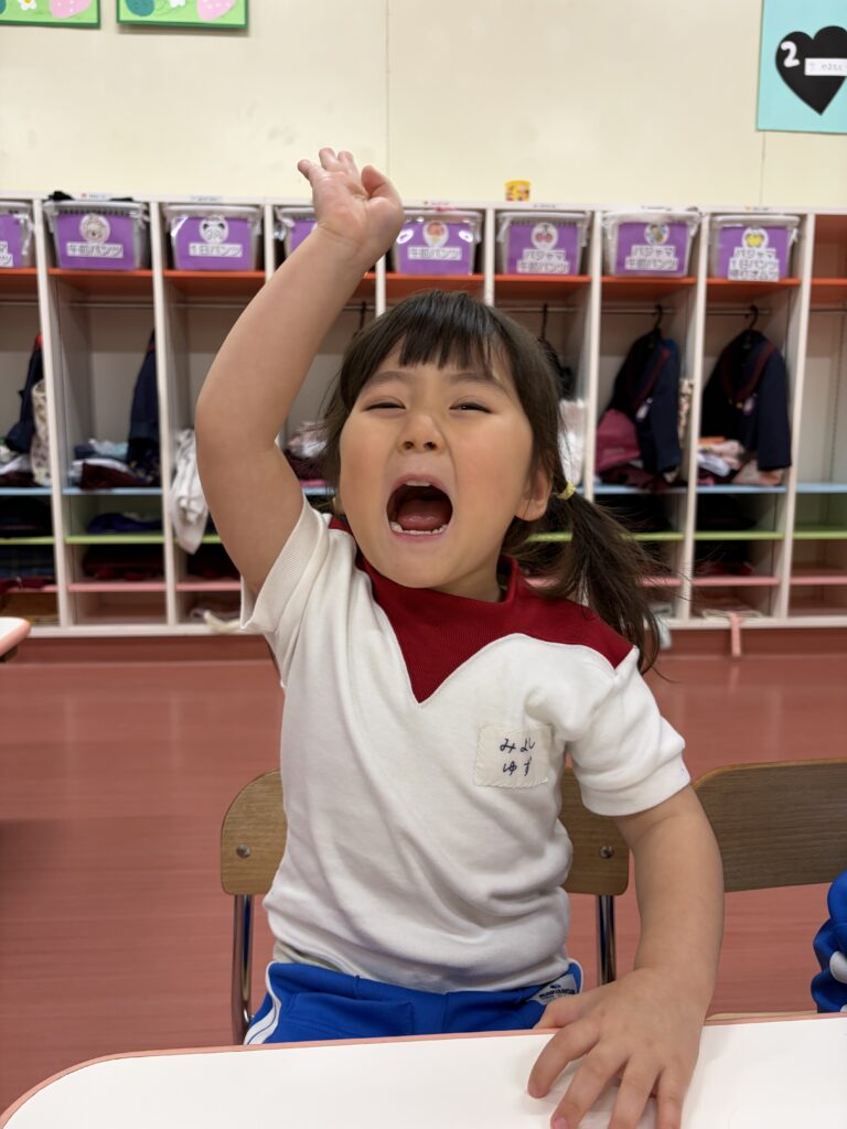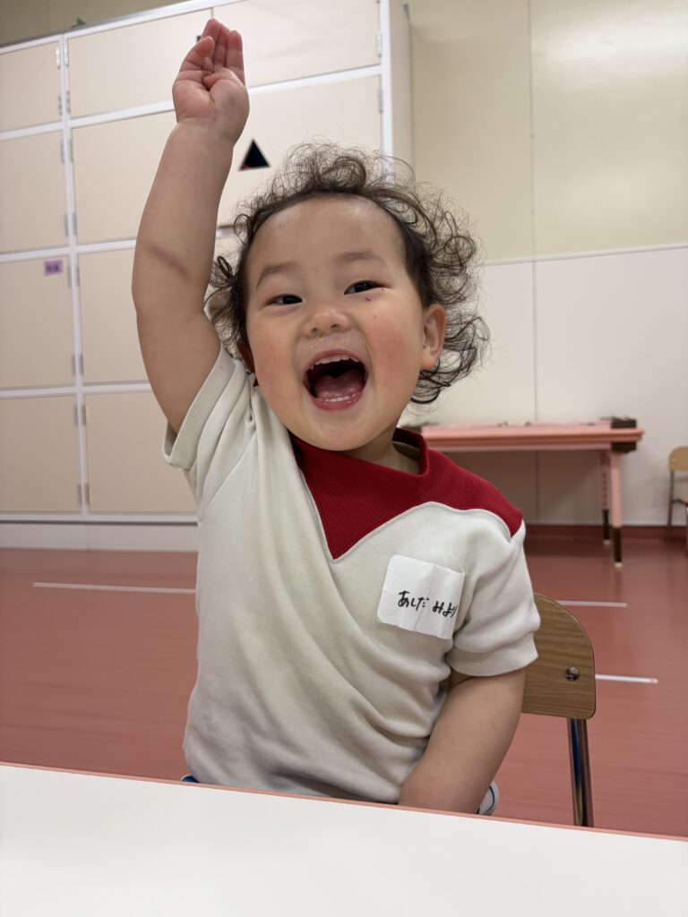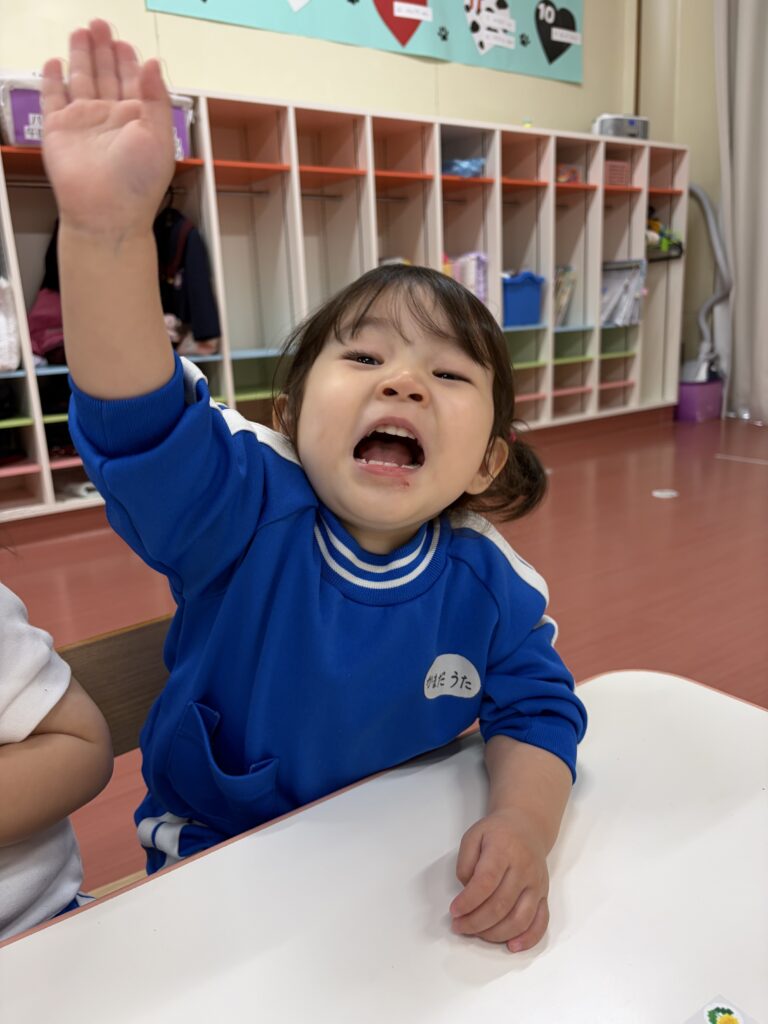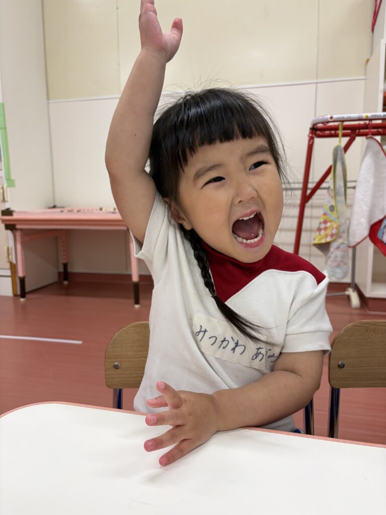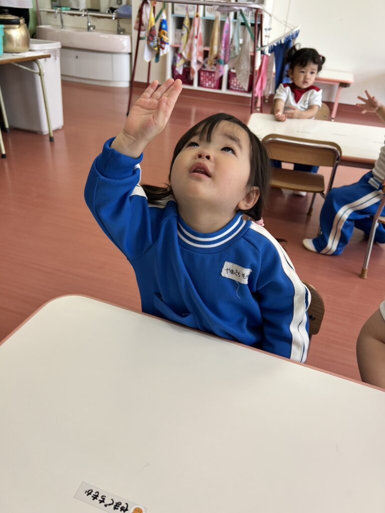 4の指で手をまっすぐ上げ、かっこいいさくらんぼさん、ぶどうさんです✨