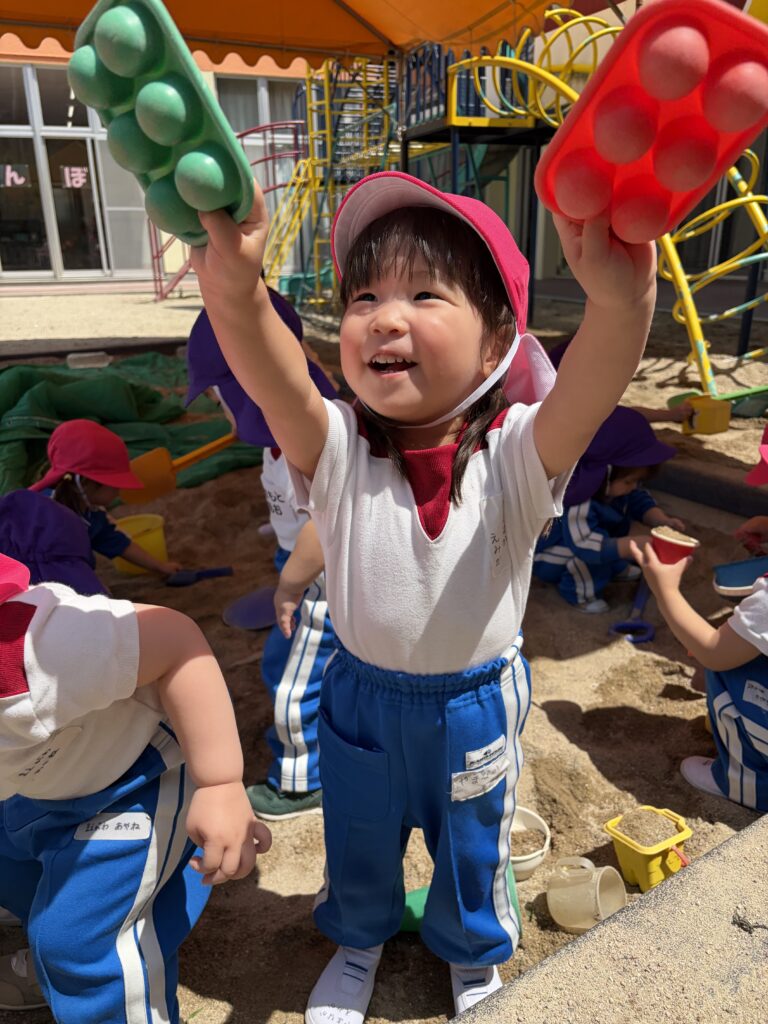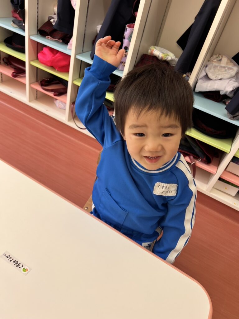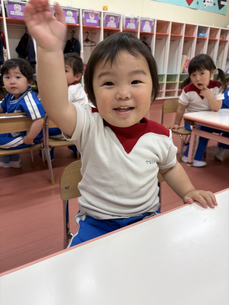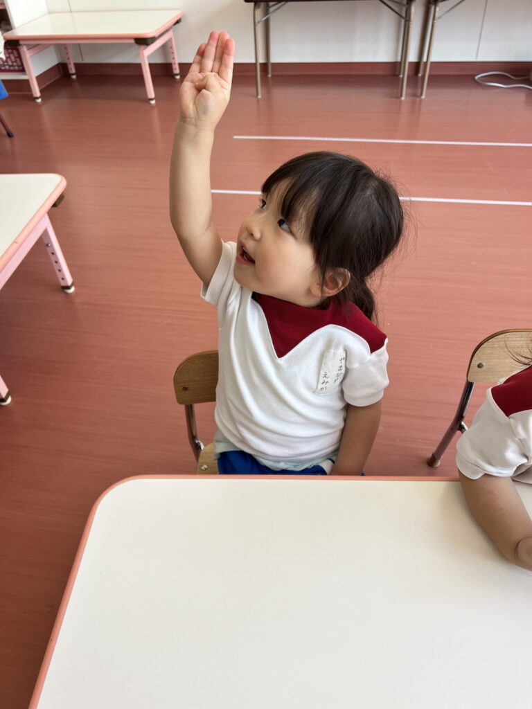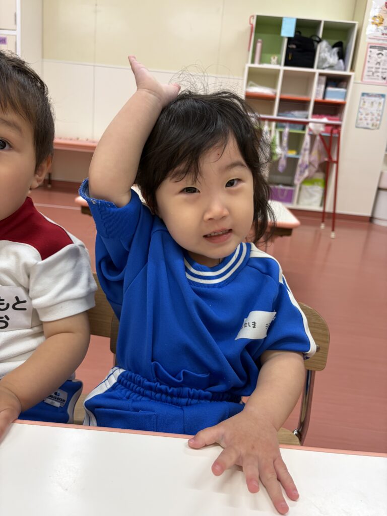4の指で手をまっすぐ上げ、かっこいいさくらんぼさん、ぶどうさんです✨